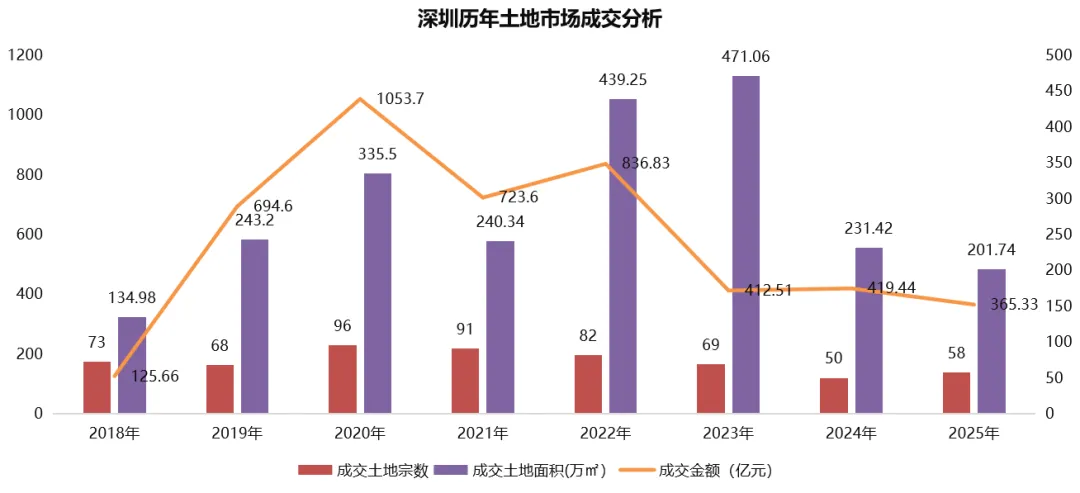 2025年土地市场成交58宗,成交面积约201.74万㎡,成交金额约365亿。