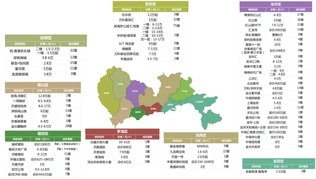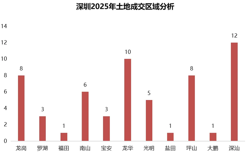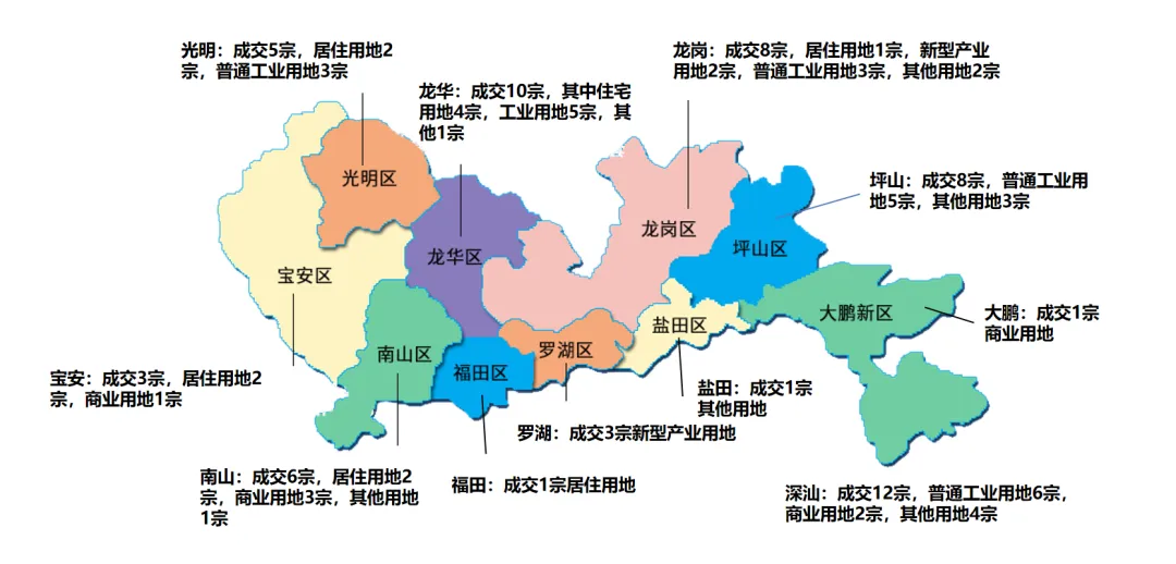 ► 从成交区域来看,深汕12宗,龙华10宗,龙岗、坪山各8宗,南山6宗。