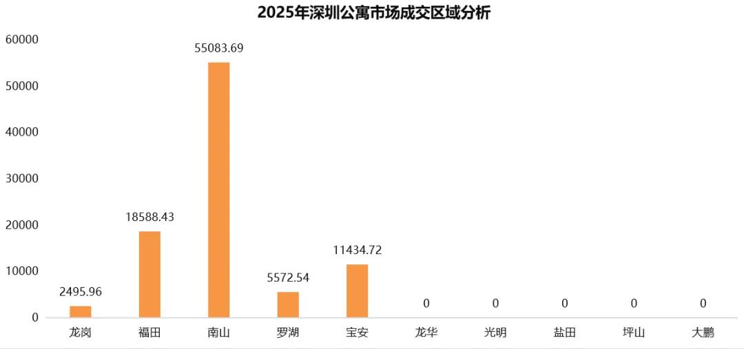 ► 2025年商铺市场,南山区成交面积第一,约1.1万㎡,其次是罗湖区成交约0.98万㎡,坪山成交约0.54万㎡。