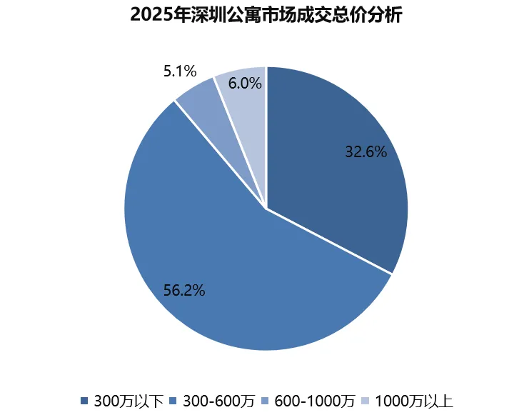 ► 总价300万以下公寓成交占比32.6%,300-600万占比提升至56.2%;1000万以上占比6%。