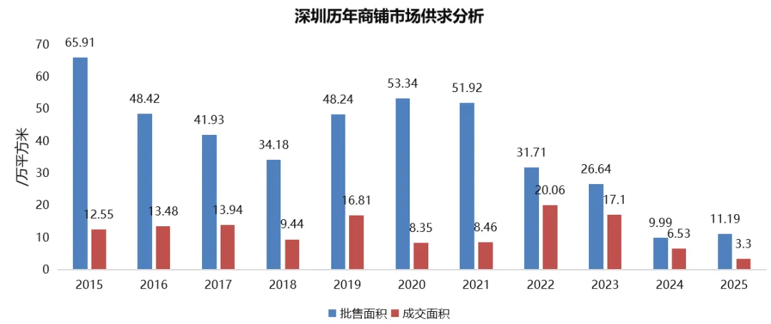 官方数据显示:2025年深圳商铺市场活跃度下滑明显,供应超11万㎡,仅成交3.3万㎡。