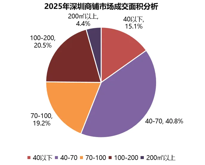 ► 2025年,面积40㎡以下商铺成交占比15.1%,40-70㎡占比40.8%,70-100㎡占比19.2%,100-200㎡占比20.5%,提升明显;200㎡以上4.4%;