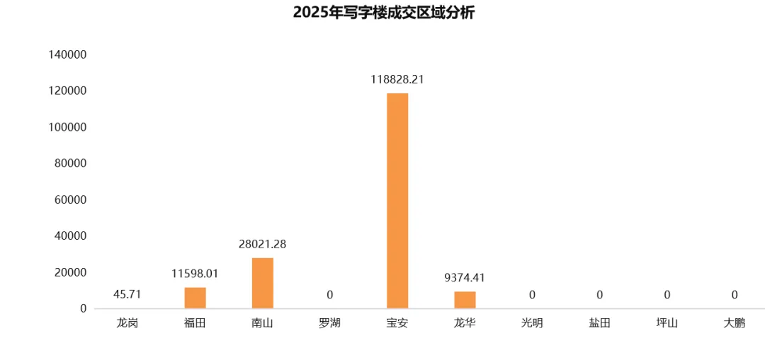 ► 2025年,深圳写字楼各区成交面积中,宝安区居榜首,成交约11.88万㎡;南山居第二,成交约2.8万㎡,福田成交约1.16万㎡。