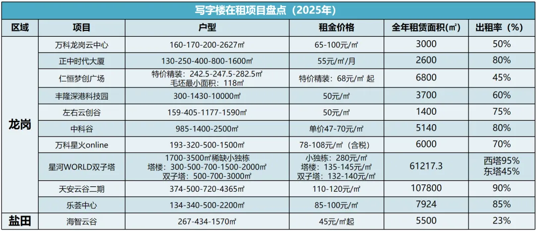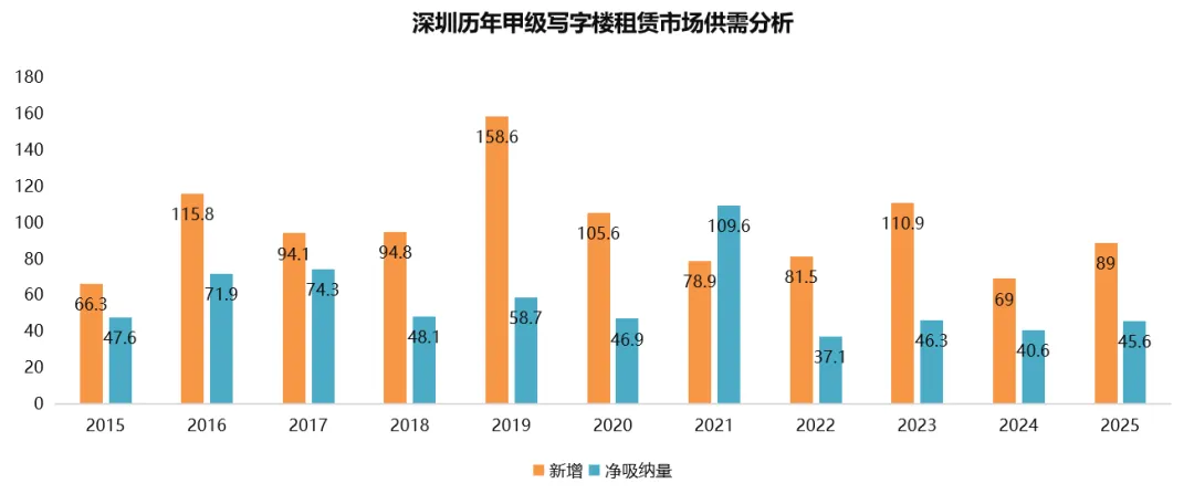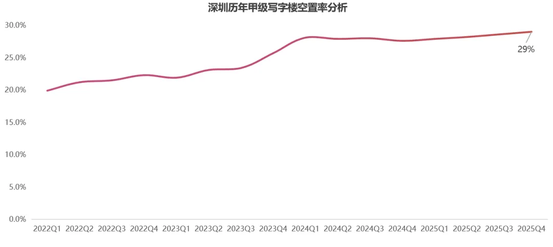 2025年,深圳甲级写字楼供应超89万㎡,同比去年上升29%,未来几年供应量还将大量释放,去化压力较大。
