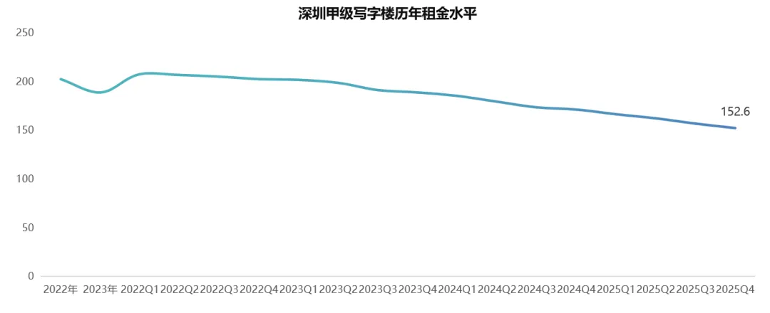 ► 截至2025年第四季度,租金继续下降至152.6元/㎡,市场实际成交租金更低,未来租金下降还将持续;当前竞争激烈的市场,业主方只能以更低的价格和优异的免租政策吸引租客入驻。