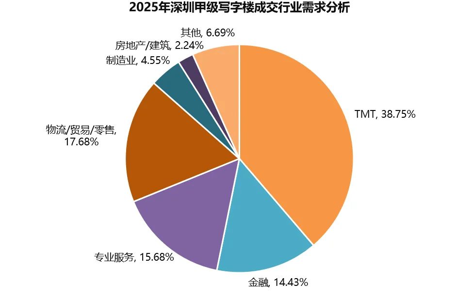 TMT行业领衔需求榜,成交占比约38.75%,金融和专业服务相差无几。