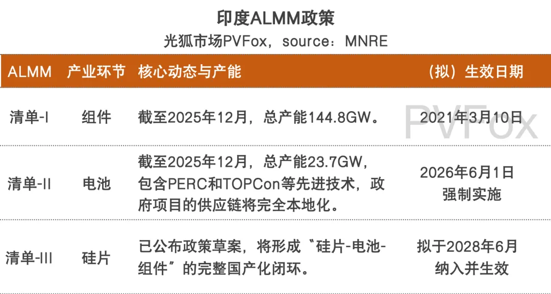 相比之下,电池片环节是当前发展的焦点与短板。根据印度能源与资源研究所(TERI)数据显示,目前印度本土电池年产能约 30 GW,尚无法完全满足组件需求。为此,印度政府祭出关键一招:2025年7月31日,新能源和可再生能源部发布了ALMM清单-II(电池),并规定自2026年6月1日起,政府项目必须使用ALMM List-I组件与ALMM List-II电池的组合,约24GW的太阳能电池制造能力已被列入ALMM清单-II。