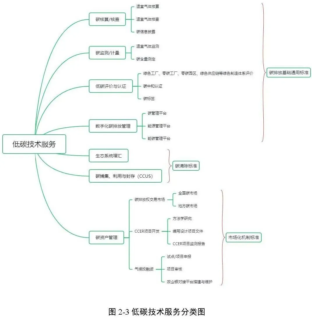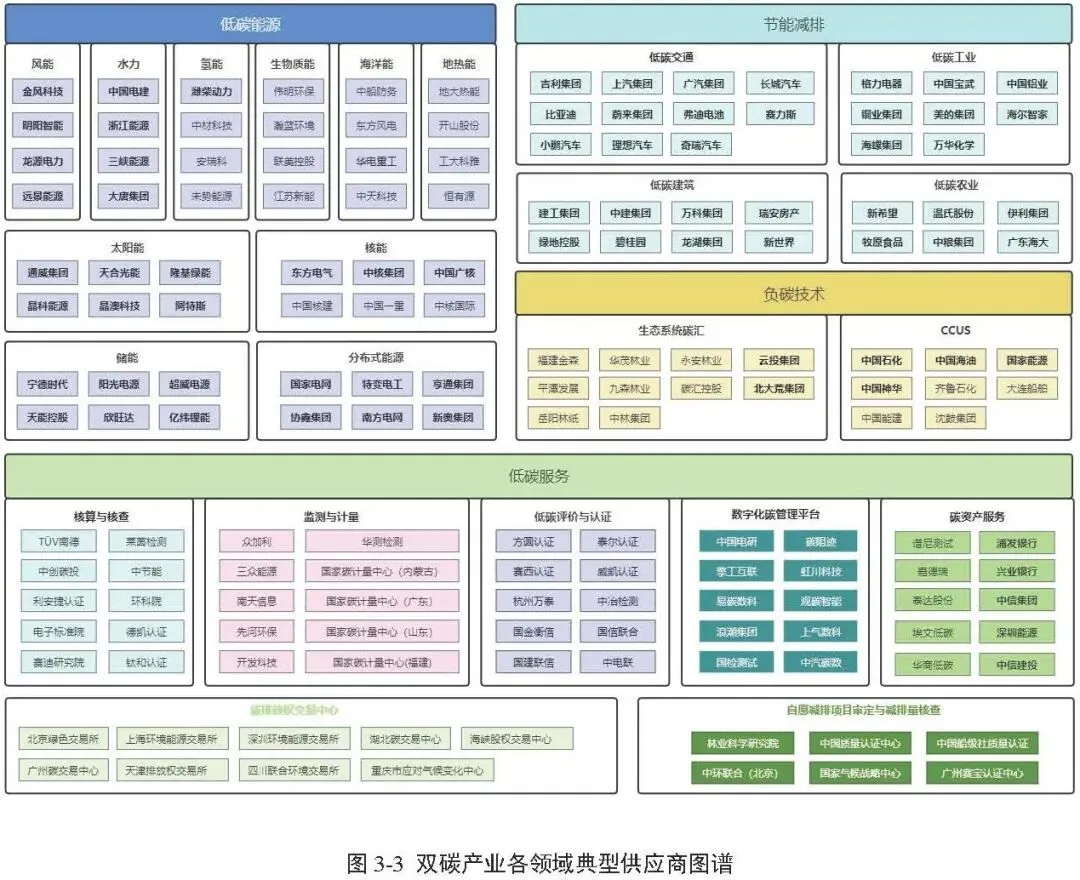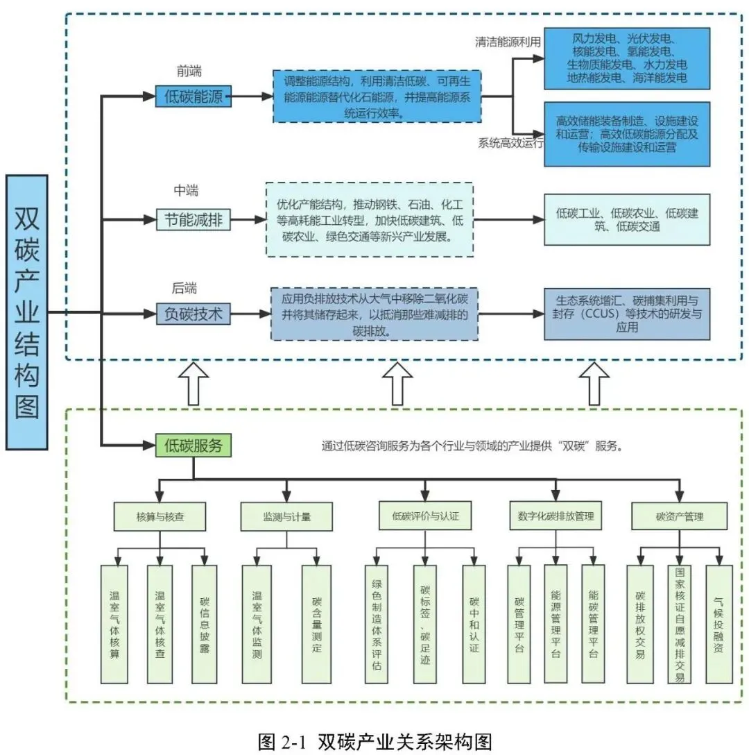 报告第二章为核心内容,参考《中国“碳中和”框架路线图研究》《碳达峰碳中和标准体系建设指南》《工业领域碳达峰碳中和标准体系》《国家(深圳)气候投融资项目分类评估表》,将双碳领域涉及到核心产业链分为能源替代类(前端)、节能减排类(中端)、负碳技术类(后端)和低碳服务类。