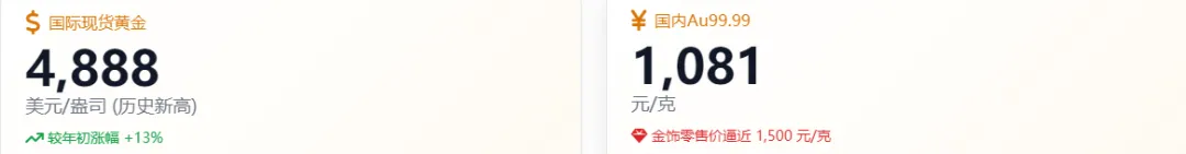 2026 年 1 月,国际黄金市场呈现爆发式增长态势。现货黄金在 1 月 21 日创下 4888.43 美元 / 盎司的历史新高,COMEX 黄金期货更是触及 4891.1 美元 / 盎司。进入 2026 年以来,国际金价累计涨幅已逼近 13%,仅 1 月份单月涨幅就达到 6% 左右。国内市场同样表现强劲,上海黄金交易所 Au99.99 报价 1081 元 / 克,沪金主连期货价格达到 1081.86 元 / 克。