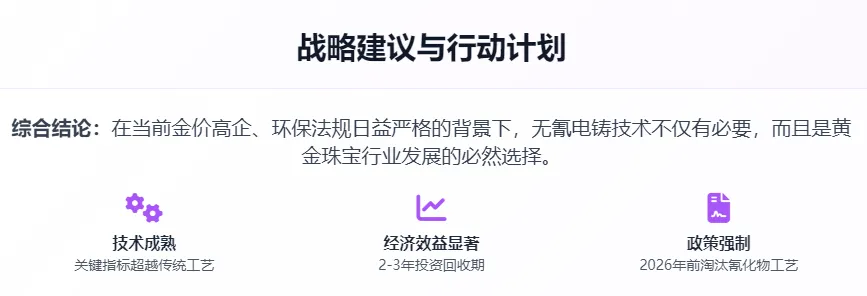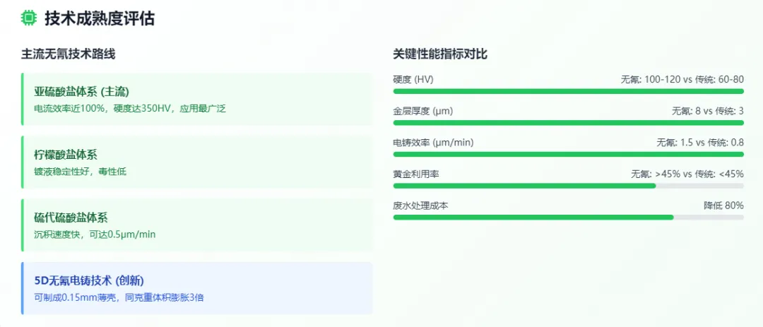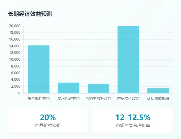 经济层面,长期效益显著。虽然初期投资较大,但通过降低黄金损耗(从 2% 降至 0.5%)、减少废水处理成本(降低 80%)、提高产品合格率(达到 76%-92%)、实现产品溢价(20%)等多重优势,投资回收期仅为 2-3 年。在当前金价高企的背景下,任何能够提高黄金利用率的技术都具有巨大的经济价值。