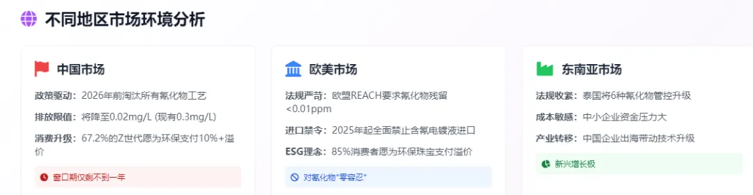 政策层面,法规倒逼转型。中国 2026 年前淘汰所有氰化物工艺的时间表已经明确,欧美市场的 "零容忍" 政策更是断绝了氰化物工艺的生路。东南亚等新兴市场的环保要求也在快速提升。可以说,无氰技术已成为进入国际市场的 "入场券"。