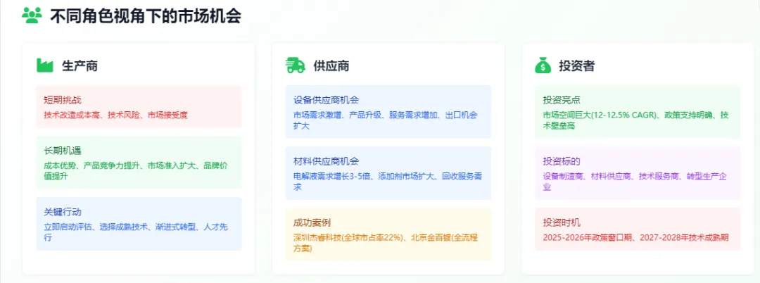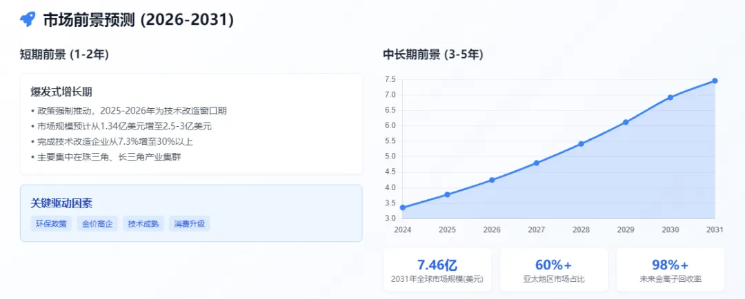 政策强制推动:中国《电镀行业规范条件》要求 2026 年前淘汰所有氰化物工艺,这意味着 2025-2026 年将是企业技术改造的最后窗口期。预计将有大量企业集中进行技术升级,形成巨大的设备和技术服务需求。