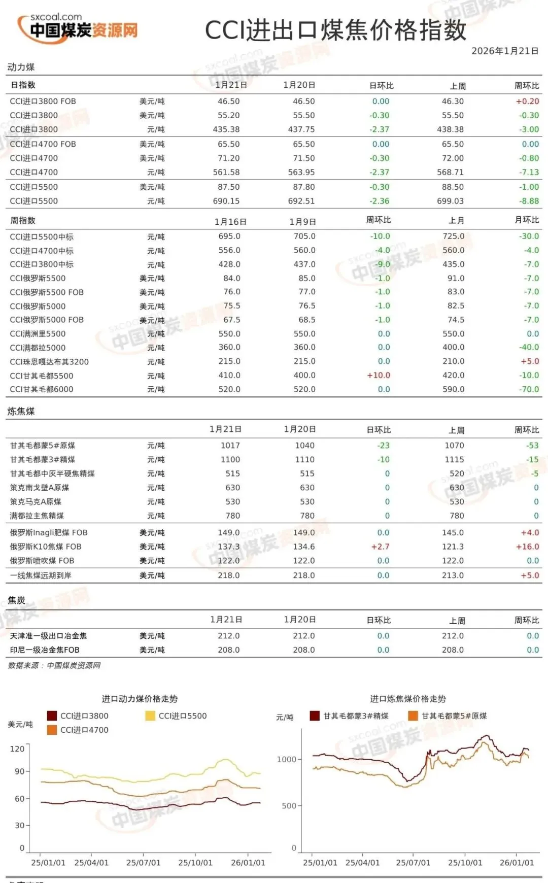 【进口炼焦煤21日蒙古国进口炼焦煤市场震荡波动运行。期货盘面弱势下调,口岸贸易企业价格有所松动,下游企业询盘问价偏低,市场成交情况一般,甘其毛都口岸库存相对高位,现已突破390万吨,终端焦钢企业补库周期下市场情绪未有明显好转,蒙煤市场供需基本格局有待改善。现甘其毛都口岸:蒙5#原煤1018,蒙5#精煤1234,蒙4#原煤990,蒙3#精煤1100,1/3焦原煤710;河北唐山:蒙5#精煤1390;均为对应提货地结算含税现金价。后续重点关注口岸监管区库存情况、国内产地煤矿复产情况和国内铁水产量波动对贸易的影响。(单位:元/吨)