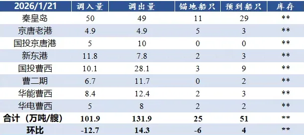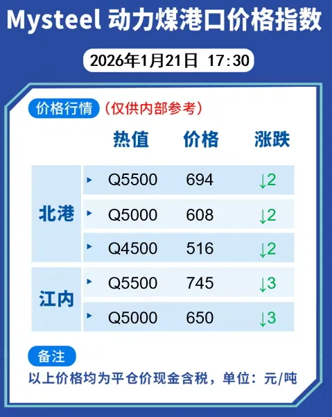 【港口】21日北港市场动力煤价格延续偏弱运行。昨日市场整体交投延续冷清,上下游僵持态势持续,市场参与者信心逐步走弱,报价普遍下调,成交稀少。当前港口交投情况难有改观,终端电厂存煤可用天数乐观,对市场煤采购积极性较弱,仅以满足刚需为主。需求释放有限,市场交易分歧,预计短期内港口煤价将延续僵持运行,后市需持续关注天气影响计划及港口库存变化等情况。截至1月20日环渤海八港库存2617万吨,日环比下降3万吨。现区域内Q5500报695-705元/吨,Q5000报610-620元/吨,Q4500报510-525元/吨。