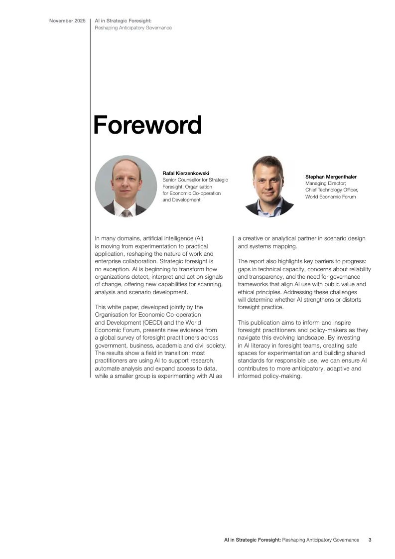 人工智能与战略预见的交汇带来了机遇与挑战。人工智能的创新开启了通往几年前还无法想象的未来场景的大门。这项技术影响着世界各地的决策者,或许对战略预见从业者的影响最为显著。