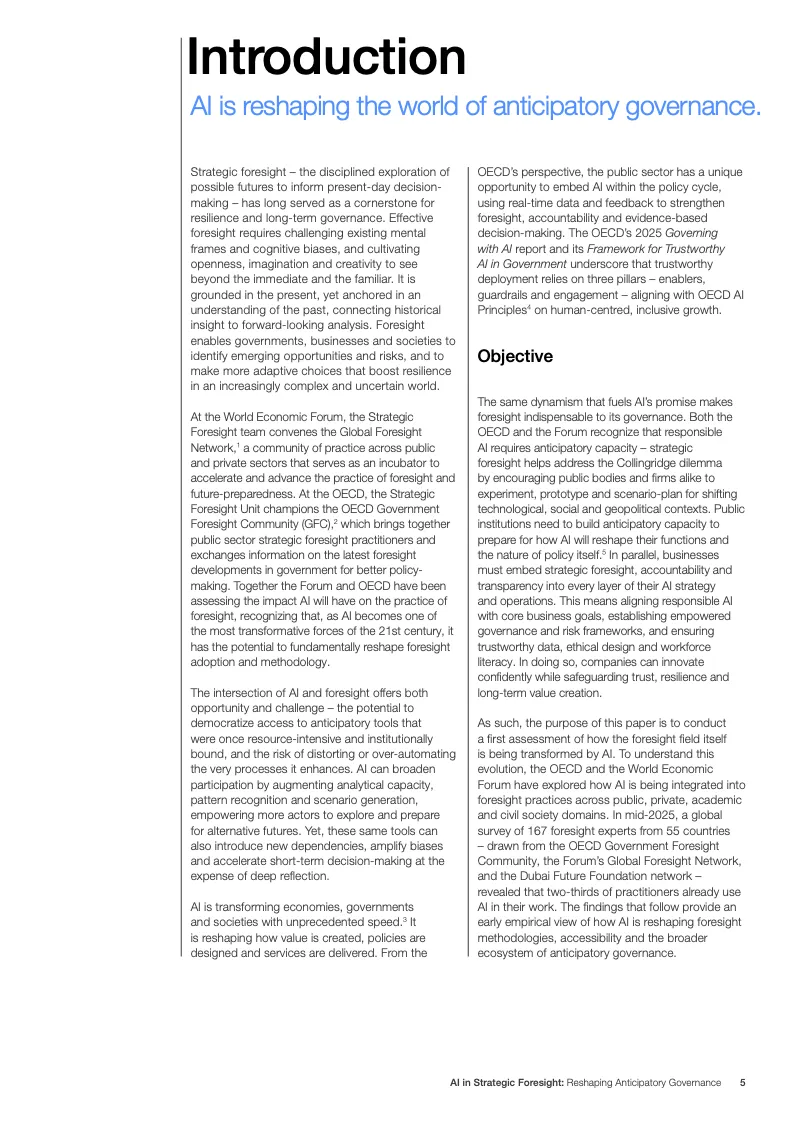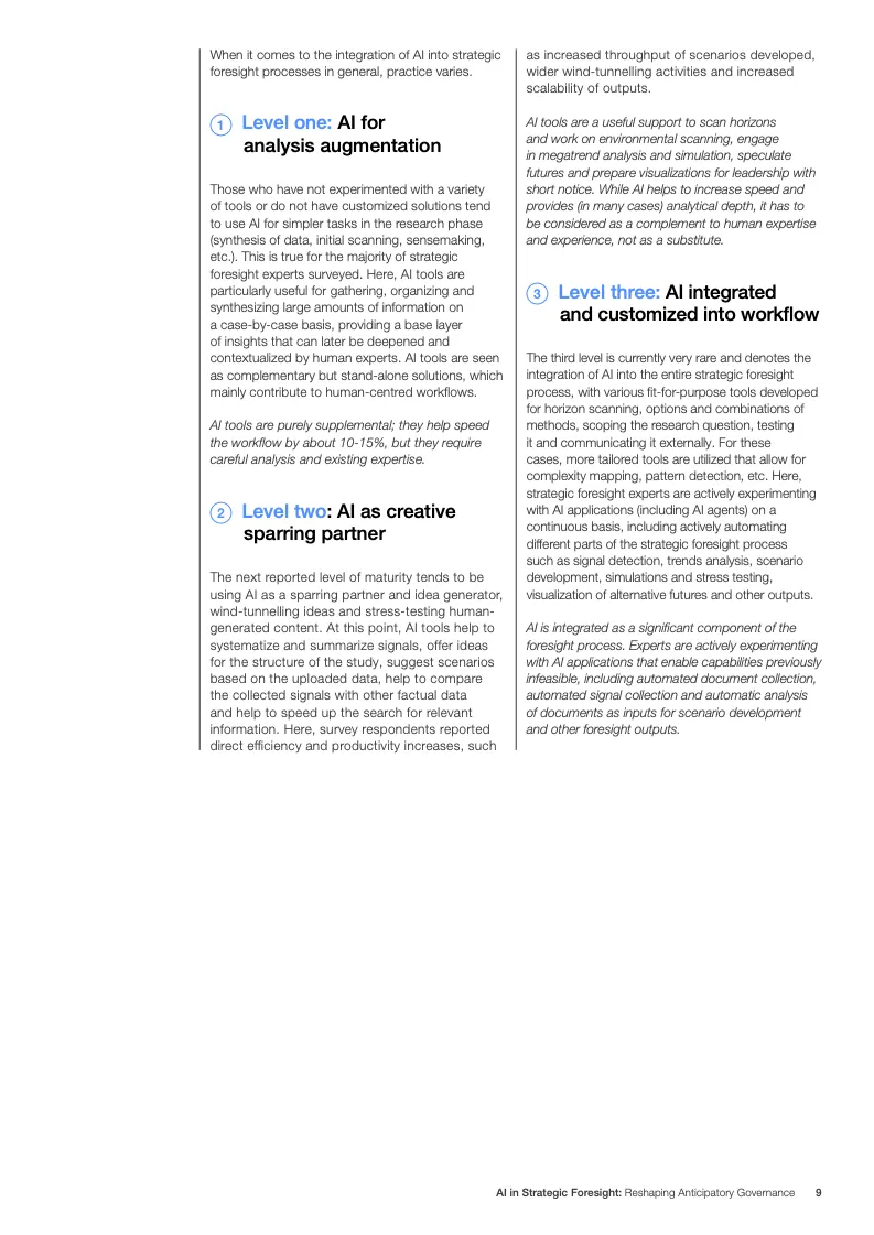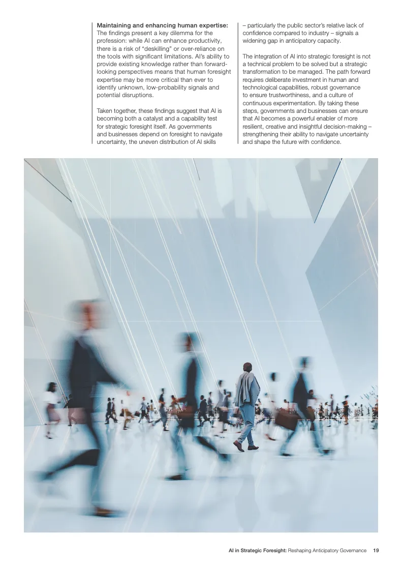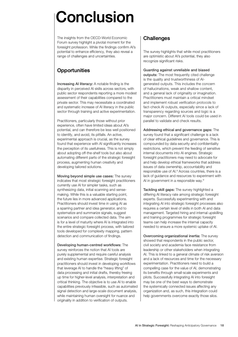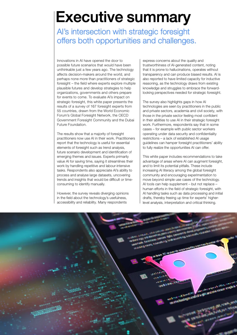 本白皮书包括一些建议,以利用人工智能可以增强预见的行业,并限制其潜在的缺陷。这些建议包括提高全球预见社区的人工智能素养,鼓励进行实验以超越该技术的简单用例。人工智能工具可以帮助补充——但不能取代——战略预见行业的人力努力,由人工智能处理数据分析和初稿起草等任务,从而为专家进行更高层次的分析、解读和批判性思维腾出时间。