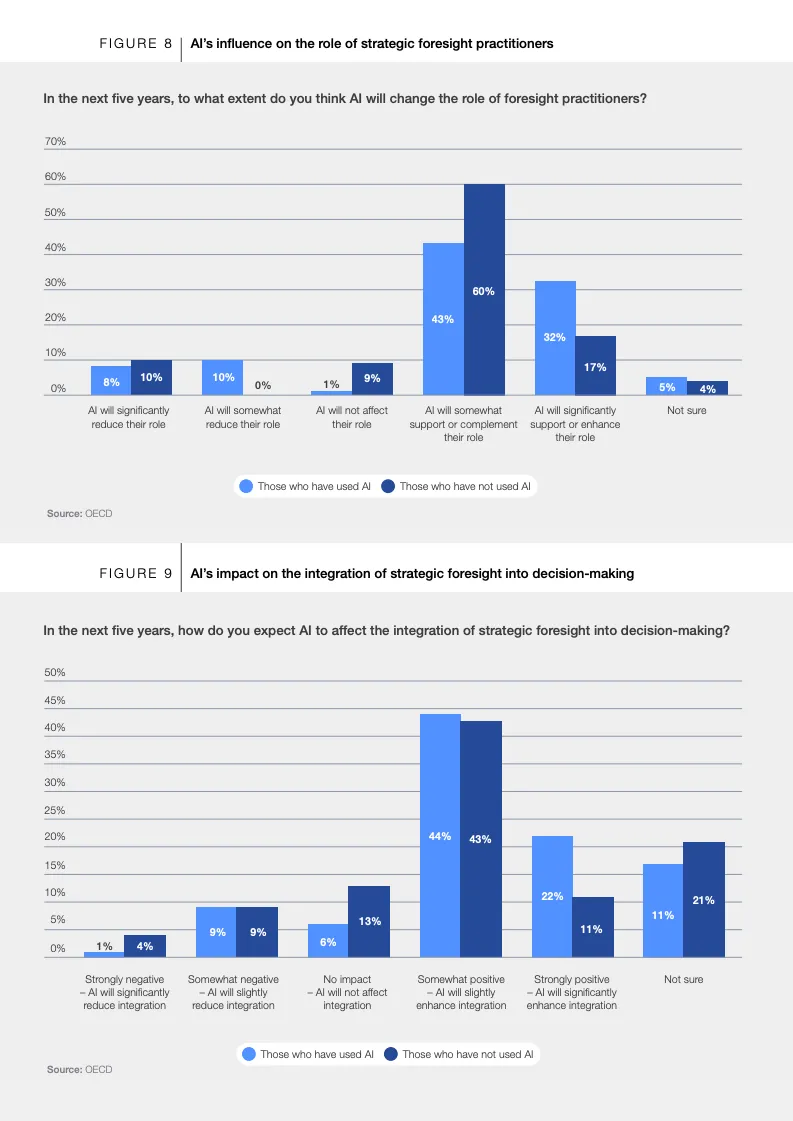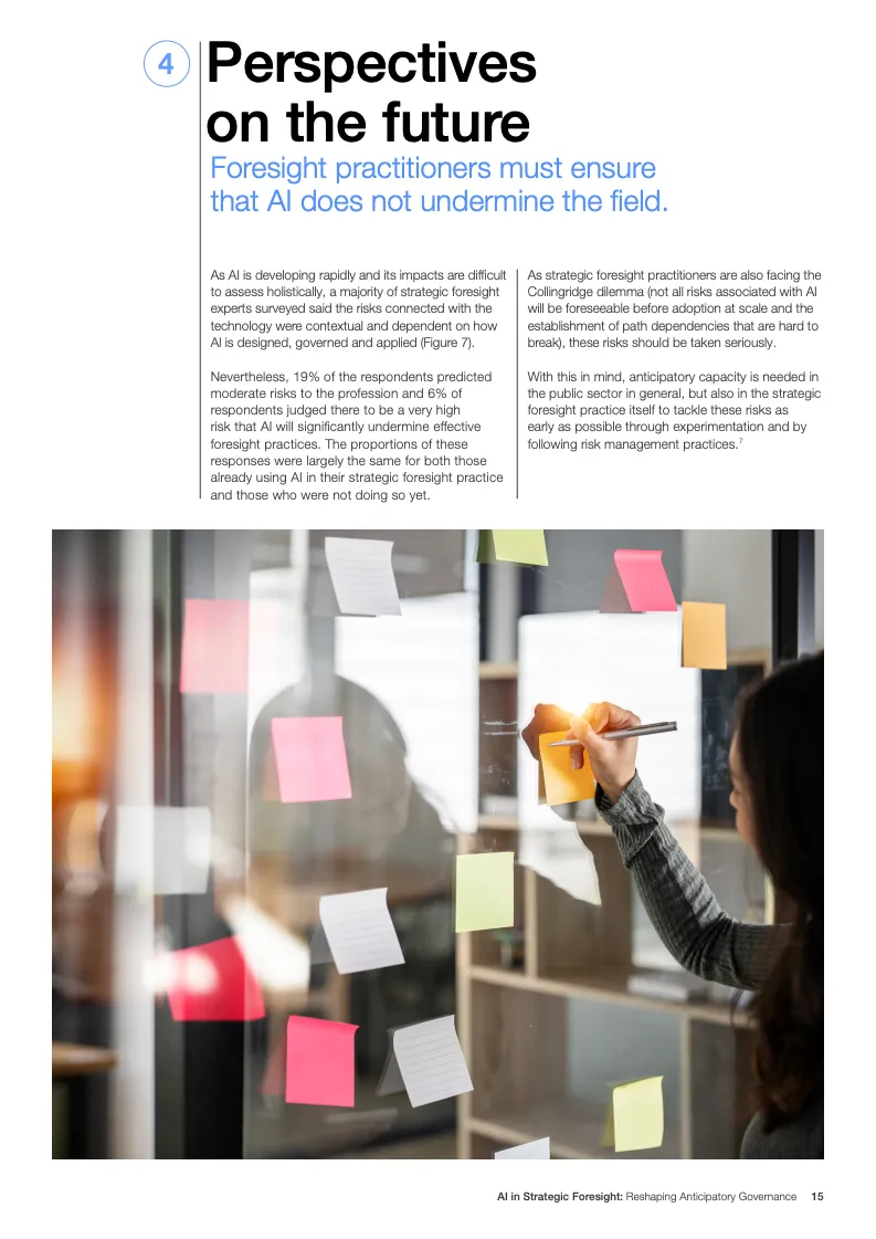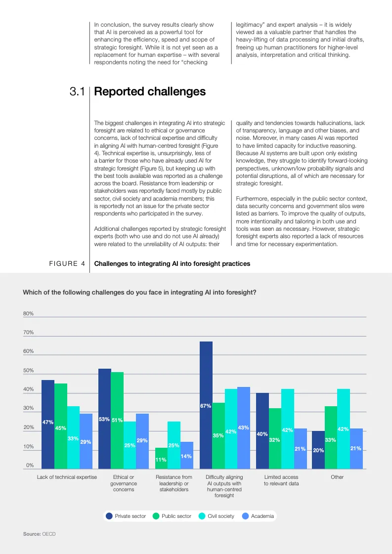调查还强调了公共和私营部门、学术界和民间社会的从业者对人工智能技术的看法存在差距,其中私营部门的从业者对其在战略预见工作中使用人工智能的能力最有信心。此外,受访者表示,在某些情况下缺乏既定的人工智能使用指南可能会妨碍预见从业者充分利用人工智能所能提供的机会。