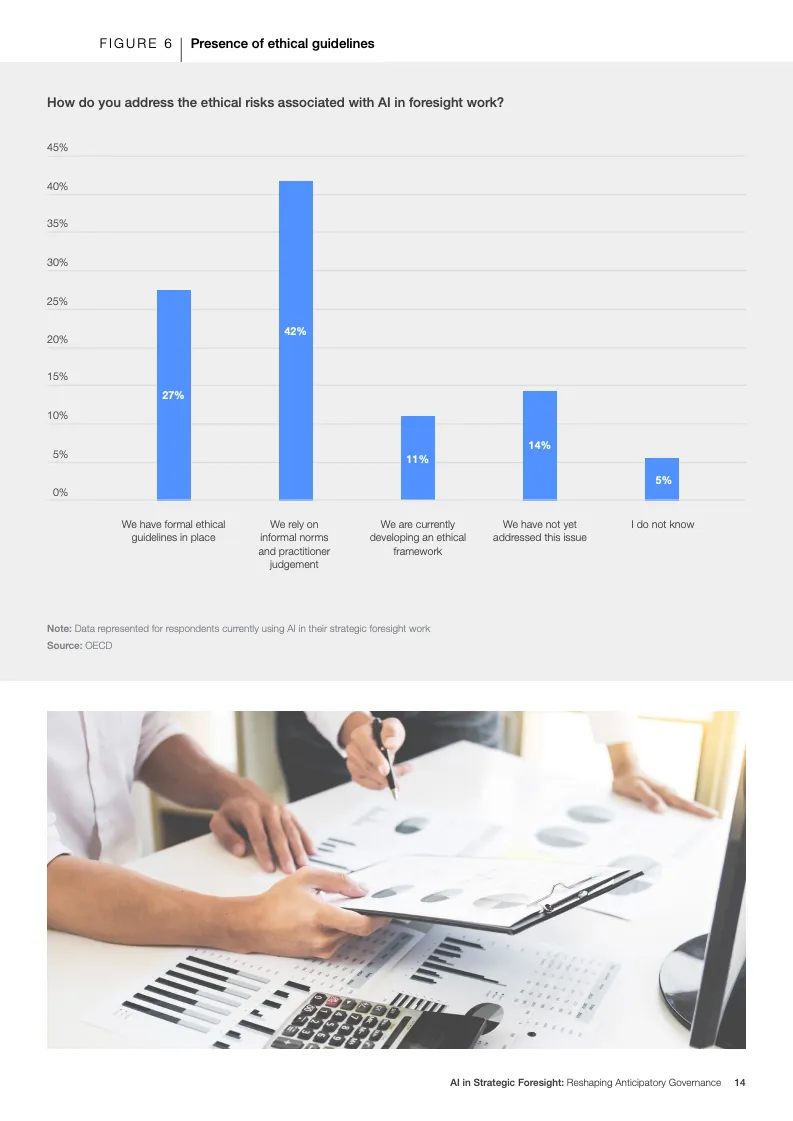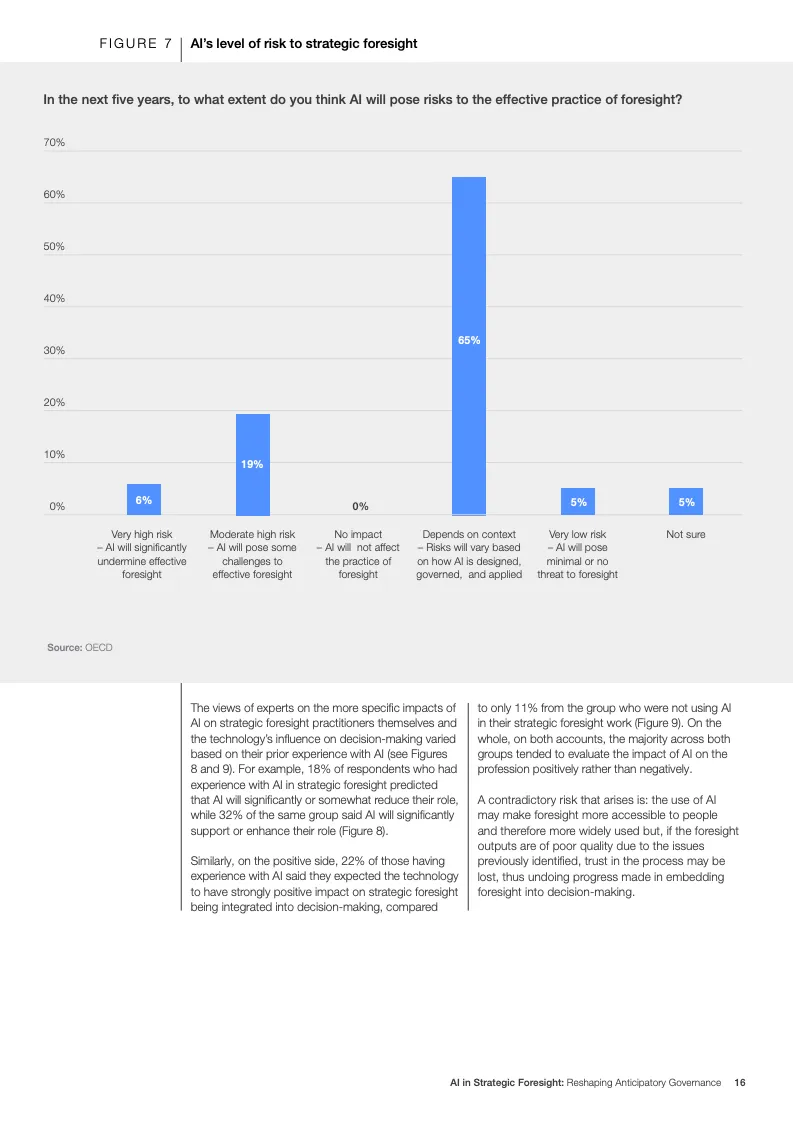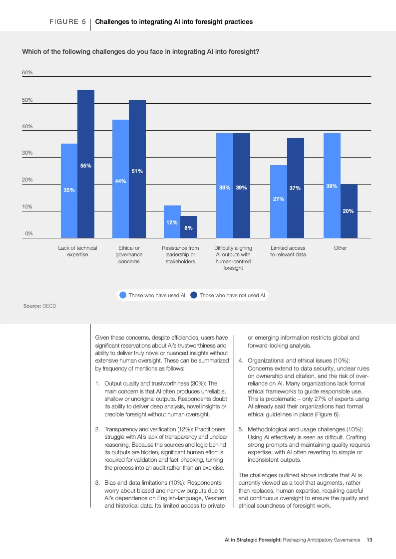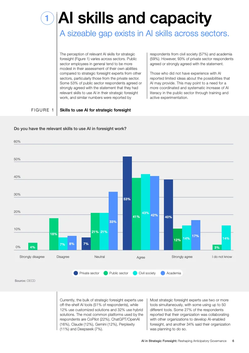 调查还强调了公共和私营部门、学术界和民间社会的从业者对人工智能技术的看法存在差距,其中私营部门的从业者对其在战略预见工作中使用人工智能的能力最有信心。此外,受访者表示,在某些情况下缺乏既定的人工智能使用指南可能会妨碍预见从业者充分利用人工智能所能提供的机会。