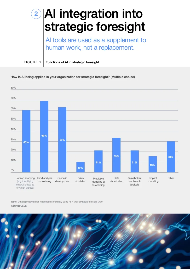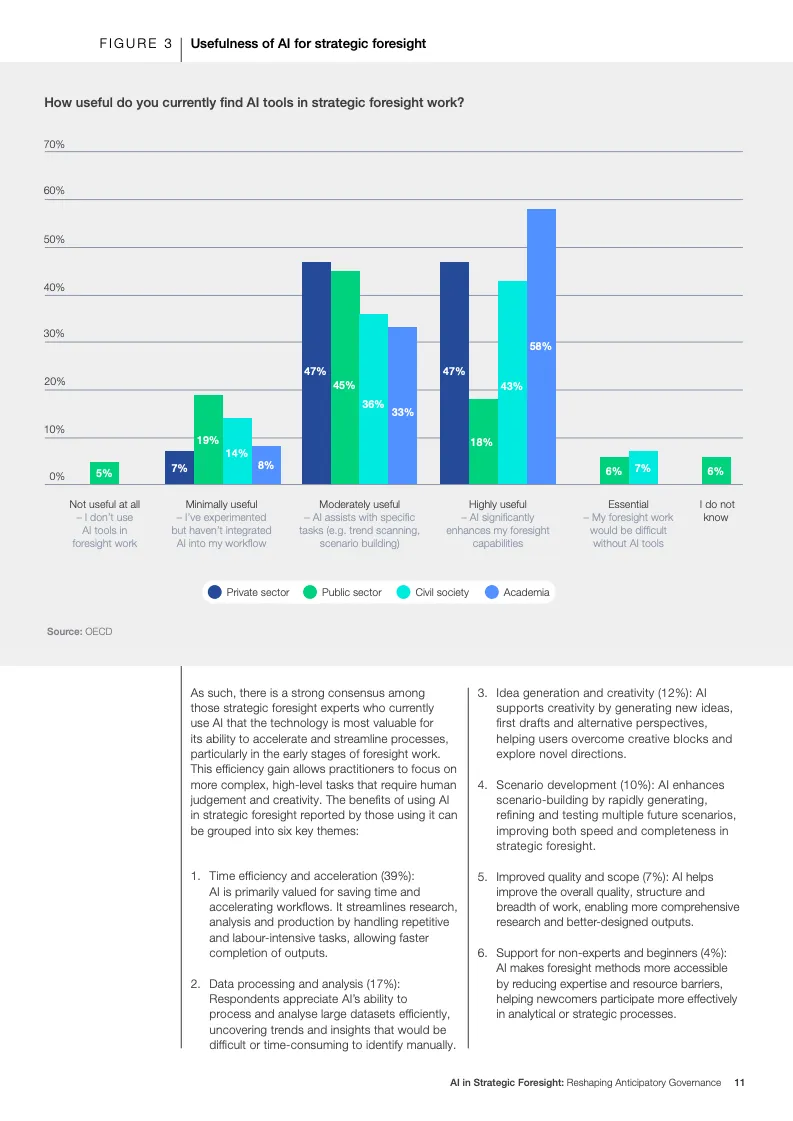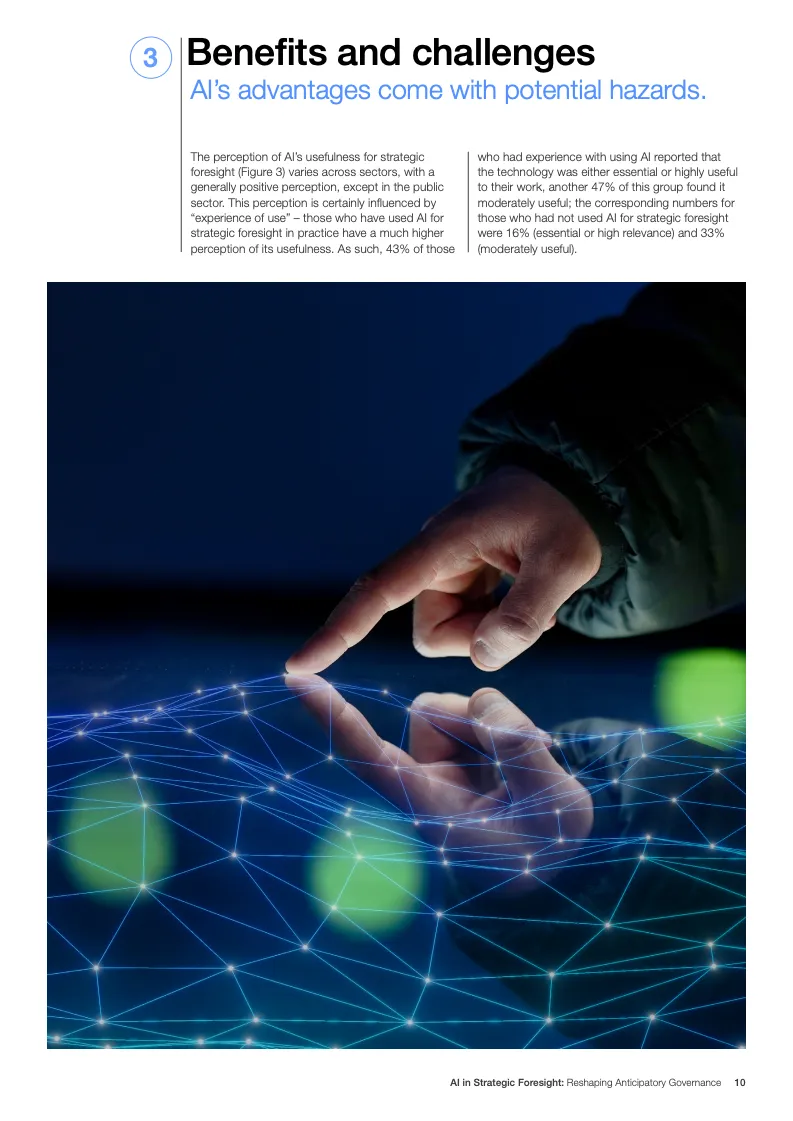 大多数预见从业者现在在工作中使用人工智能。从业者报告称,该技术对预见的基本要素非常有用,例如趋势分析、未来情景开发以及识别新兴主题和议题。专家们主要看重人工智能节省时间的能力,称其通过处理重复性和劳动密集型任务来简化他们的工作。受访者还赞赏人工智能处理和分析大型数据集的能力,能够发现难以或耗时才能手动识别的趋势和见解。