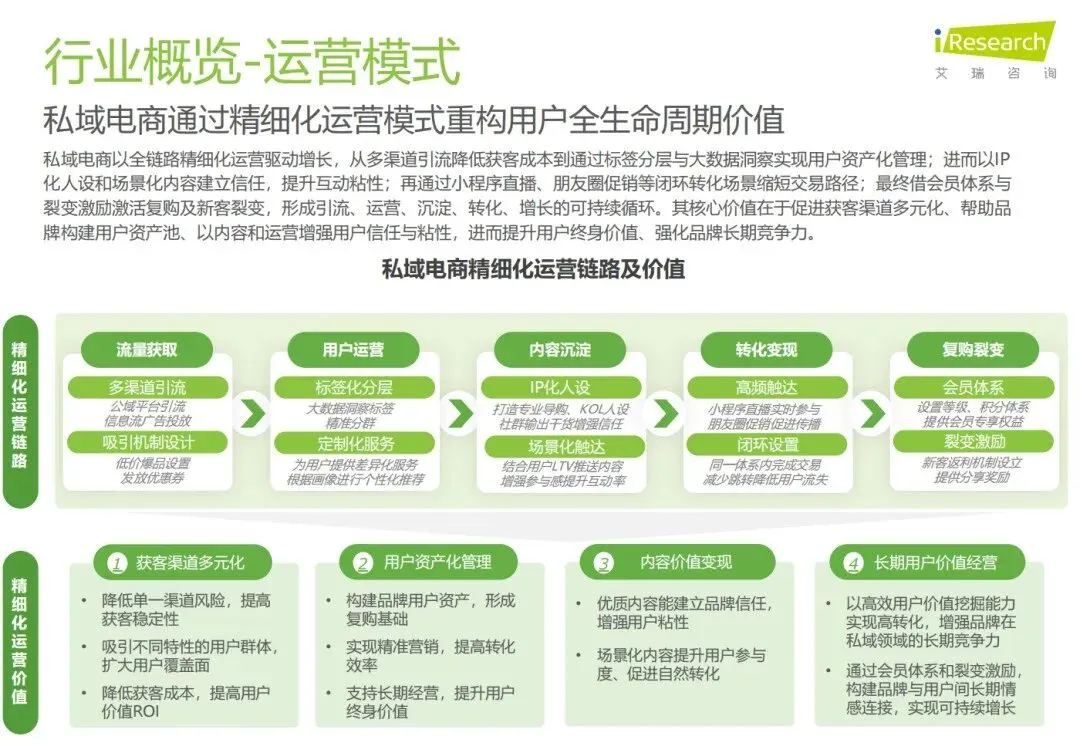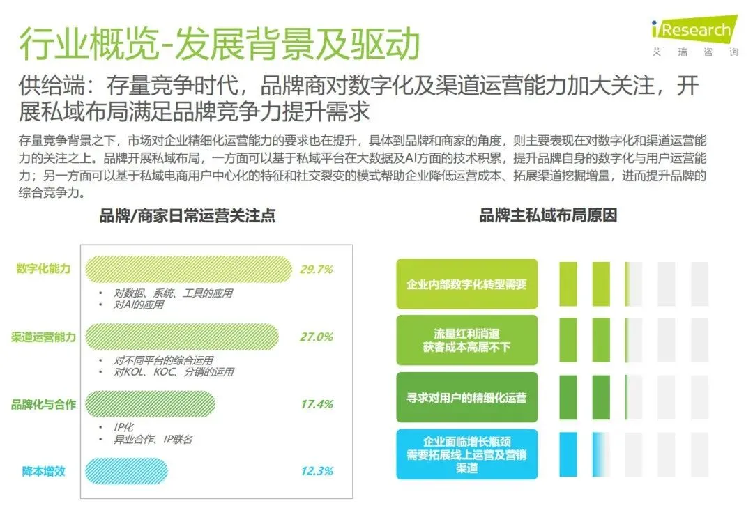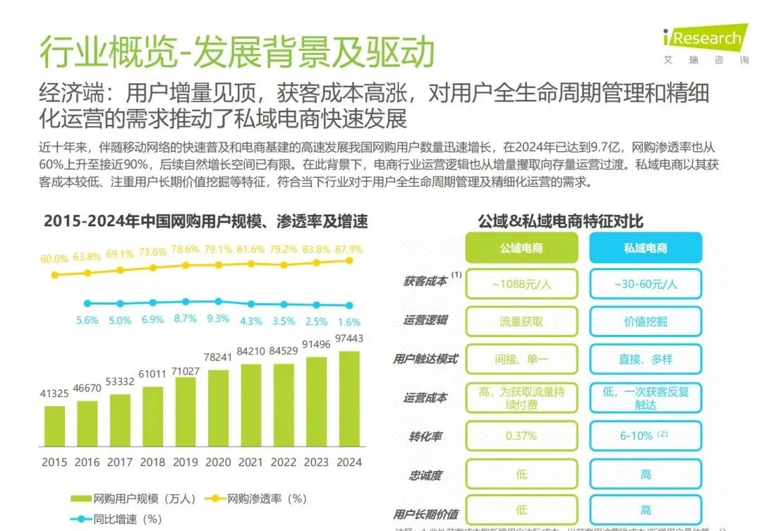 在用户增量见顶、获客成本持续高企的宏观背景下,私域电商行业逆势崛起,步入快速发展通道。行业不再依赖粗放式流量获取,转而通过精细化、差异化的运营策略精准触达用户,并与个性化需求深度对接。与此同时,私域电商凭借其数字化工具与全渠道运营能力,助力品牌方构建核心竞争力,重塑用户全生命周期价值。