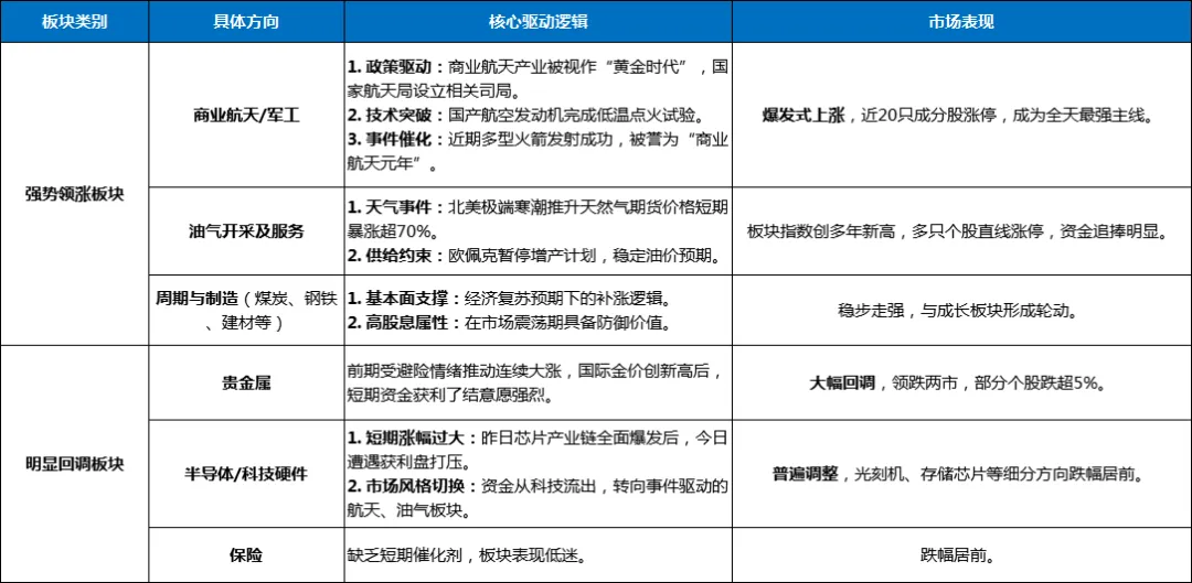 2.集中流出方向:资金从前期连续大涨的板块中撤出。贵金属板块因国际金价高位震荡,遭遇显著获利了结。同样,昨日火爆的半导体产业链也出现资金流出,市场呈现快速轮动特征。