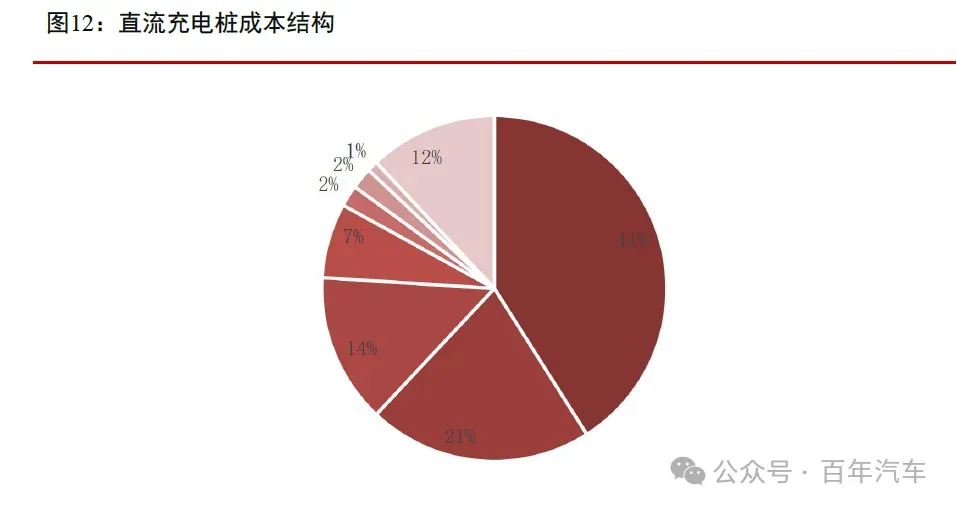 从直流充电桩的成本结构来看,充电模块是充电桩的核心部件,承载着将电网交流电(AC)转换为电动汽车所需直流电(DC)的核心功能,并实现电压、电流的精准调控。作为充电桩的“心脏”,充电模块的成本占比41%;其次,充电枪、线是充电桩的重要部件,占比21%。外壳、主控板、接触器、继电器、电表的占比分别为14%、7%、2%、2%、1%。
