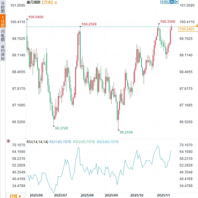 周四美元指数连续第五个交易日上涨,逼近半年高位,涨幅约0.15%,现报100.26。而欧元兑美元连续第五个交易日走低,一度达近两周低点1.1509,跌幅约0.13%。