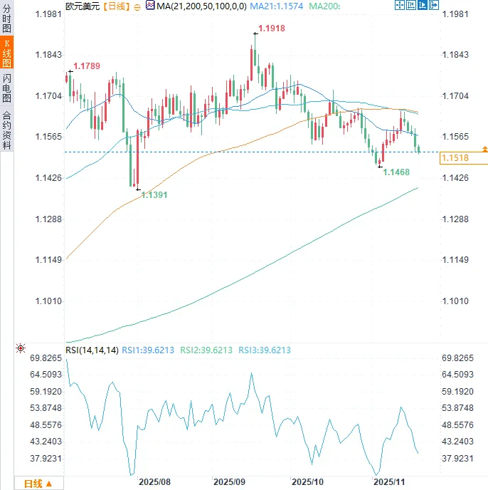 上行方面,任何反弹需有效突破21日移动均线1.1574阻力。后续看涨目标指向1.1650附近,即50日(1.1645)与100日移动均线(1.1652)交汇附近,突破后或进一步上探1.1700整数关口。