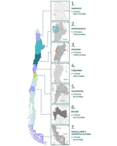 截至2025年底,智利已建成并投入运营的海水淡化厂为24座,总处理能力约907,200立方米每天,产业已进入规模化运营阶段。项目高度集中于安托法加斯塔(2. ANTOFAGASTA)、阿塔卡马(3. ATACAMA)和科金博(4. COQUIMBO)等中北部地区,这些区域既是全球最重要的矿产资源带,也是水资源压力最大的区域。