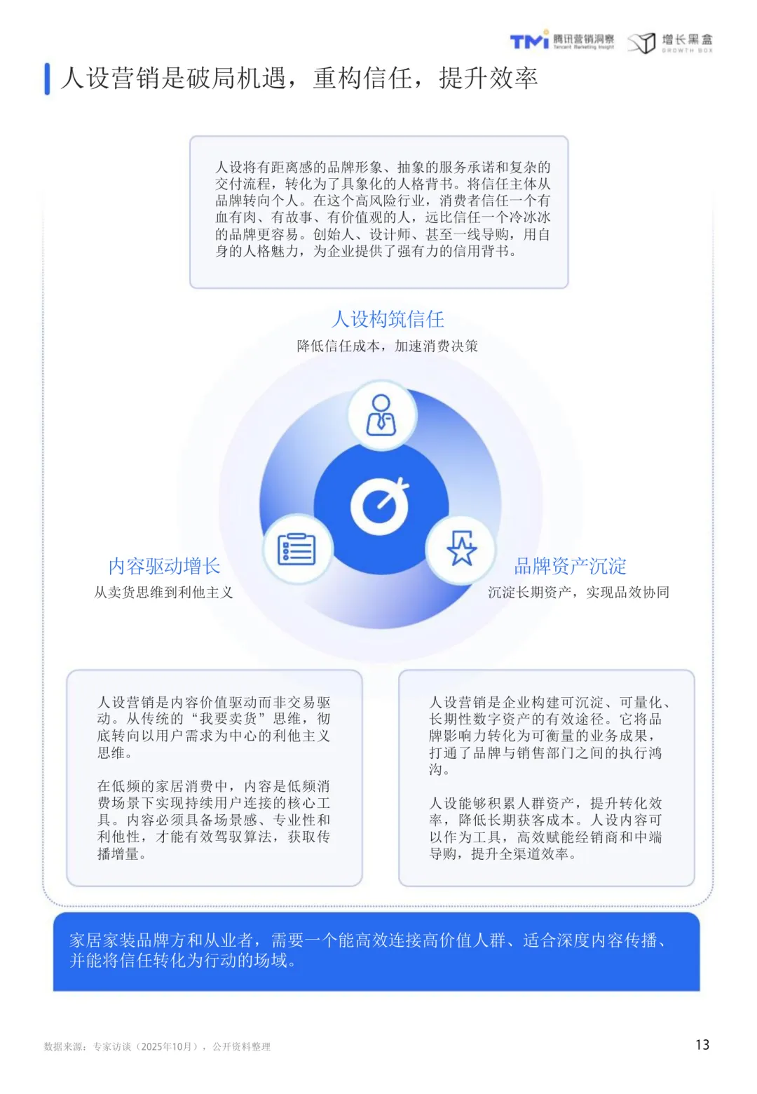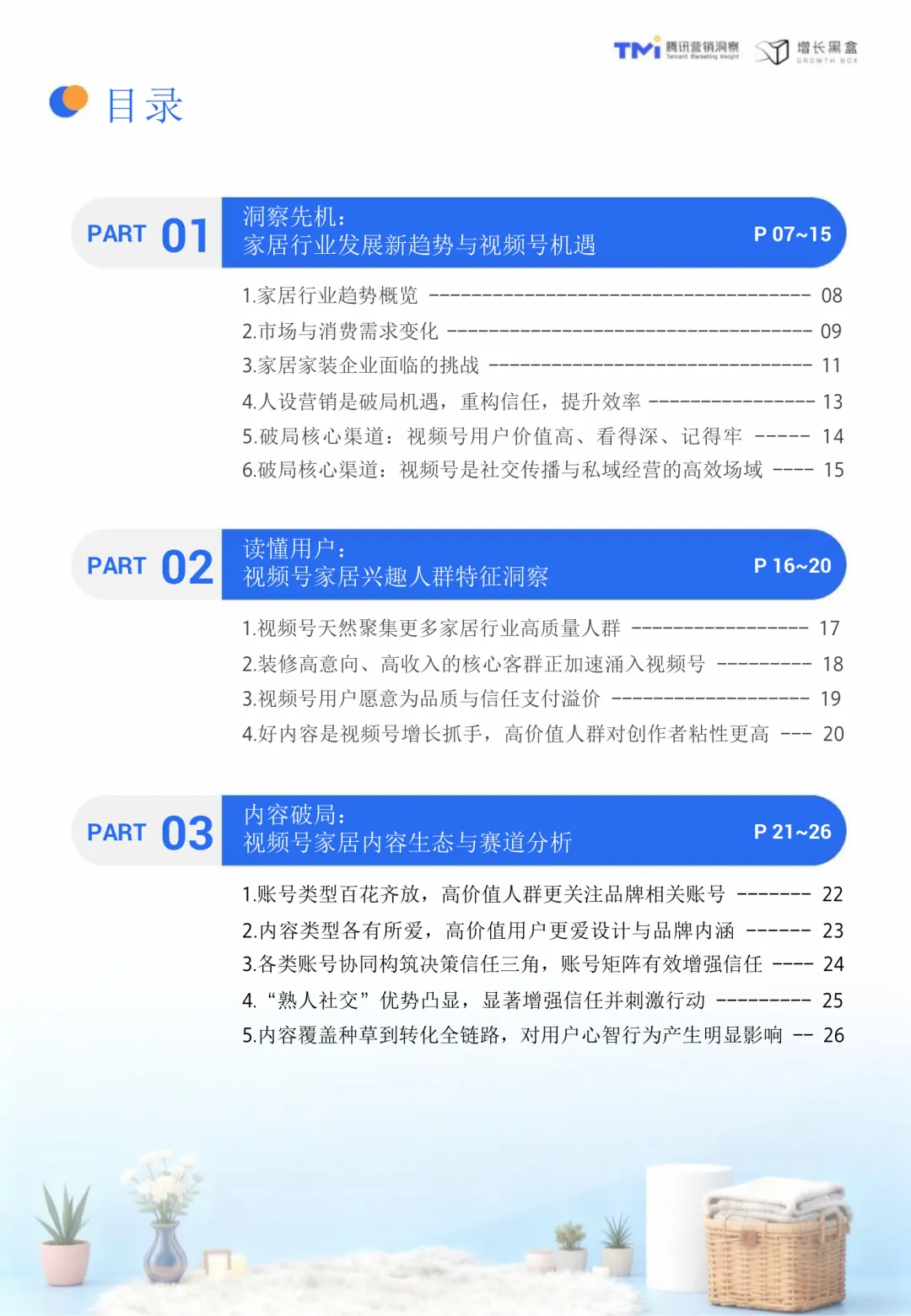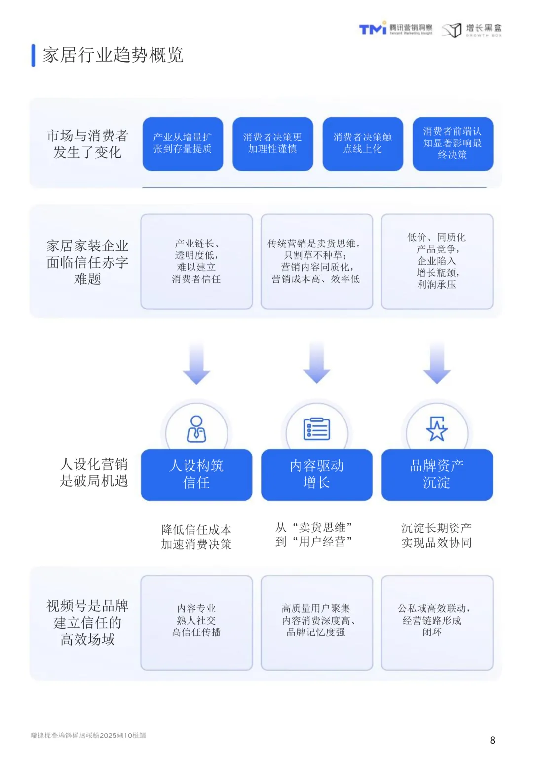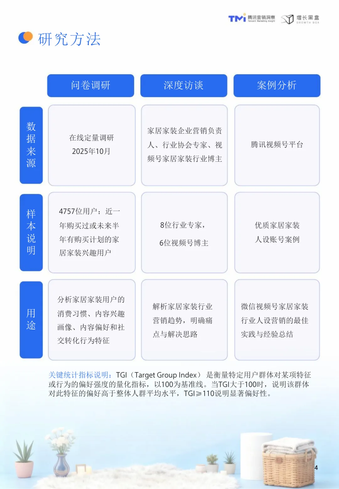 视频号家居消费趋势洞察与人设营销指南(2026版)聚焦于当前家居行业在消费行为、营销逻辑和平台应用上的深刻变化。随着市场从增量扩张转向存量提质,消费者更加理性,注重健康环保与精神满足,行业需从“重装饰”转向“重内涵”,以创造价值为核心。在这一背景下,视频号凭借其社交属性和内容传播能力,成为家居品牌建立信任、深化用户关系的理想平台。相比传统营销模式,人设营销通过将品牌形象转化为具体人格,借助真实、专业、有温度的内容,构建与高价值用户的深度连接,实现信任驱动的增长。视频号家居用户呈现出收入高、消费力强、对设计美学和品牌文化敏感等特点。他们更倾向于追随设计师和品牌账号,愿意为“软价值”支付溢价。熟人社交推荐显著提升内容可信度,社交关系的真实度是平台的核心竞争力。内容方面,精准的人设定位是关键。创始人和达人IP对高价值人群具有更强吸引力,专业性与亲和力缺一不可。内容策略应以利他为导向,围绕设计鉴赏、品牌故事和家居服务展开,满足用户需求的同时建立专业形象。公域到私域的协同转化至关重要,视频号作为连接器,需设计有效的承接机制和长期培育策略。研究方法包括问卷调研、深度访谈和案例分析,覆盖4757位用户、8位行业专家及6位视频号博主,结合腾讯视频号平台数据,全面解析家居家装行业的用户画像、内容偏好与社交转化行为特征。TGI指标用于衡量特定群体对某项特征的偏好强度,为内容策略提供量化依据。视频号不仅是一个内容分发渠道,更是一个承载重度服务的生态平台,其社交裂变、公私域打通和长效转化机制,与家居行业的高客单价、长决策周期高度契合。通过人设营销,品牌可以在视频号生态中实现从流量触达到心智深耕的可持续增长。