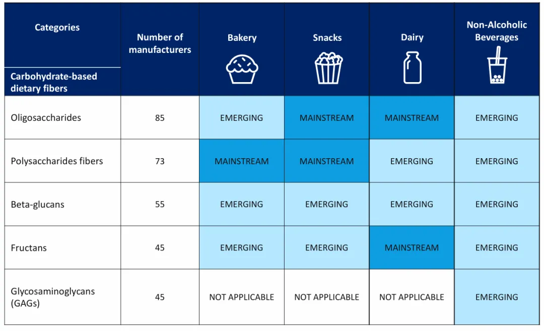 图表2:五大纤维成分在不同品类中的成熟度:多糖纤维在烘焙和零食中已成主流,低聚糖在零食和乳制品中应用成熟,β-葡聚糖和果聚糖在多数品类仍处于新兴阶段。
