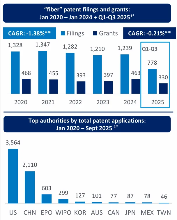 图表3:2020-2025纤维相关专利申请与授权趋势:专利申请量从2021年峰值回落,但授权率稳定在30%左右,显示企业更聚焦于实质性技术创新。