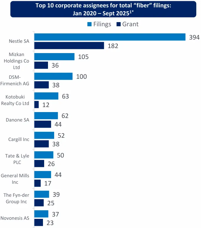 图表4:纤维专利申请top10企业排名:雀巢以394件申请领跑,达能、嘉吉等食品饮料与配料商占据榜单前列。