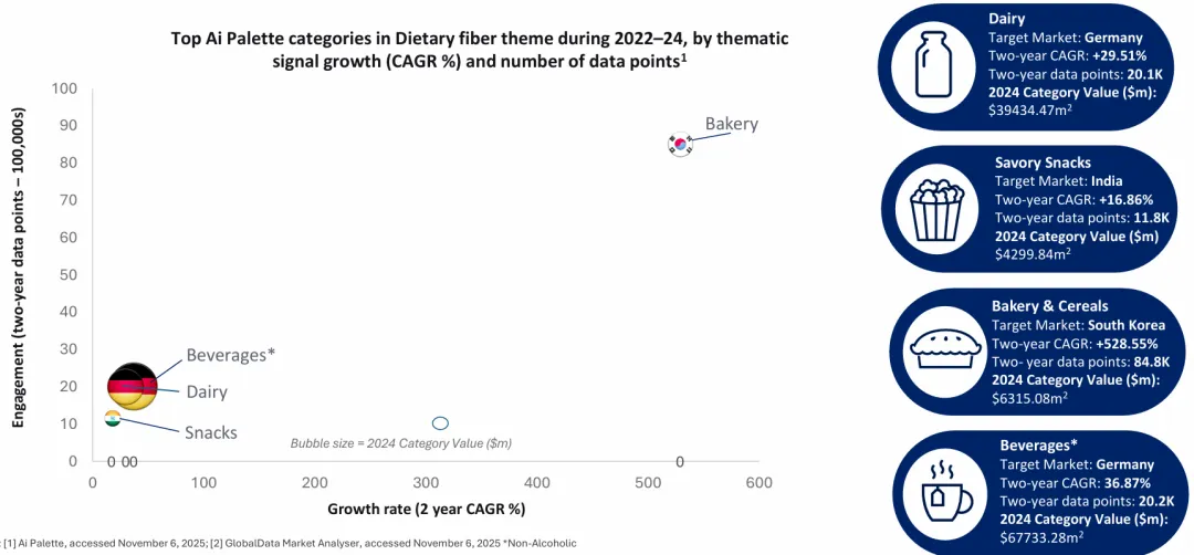 图表5:膳食纤维主题在不同品类的增长率与参与度(2022-2024):韩国烘焙品类纤维主题参与度爆发式增长(CAGR +528%),德国乳制品和饮料市场也展现强劲势头。