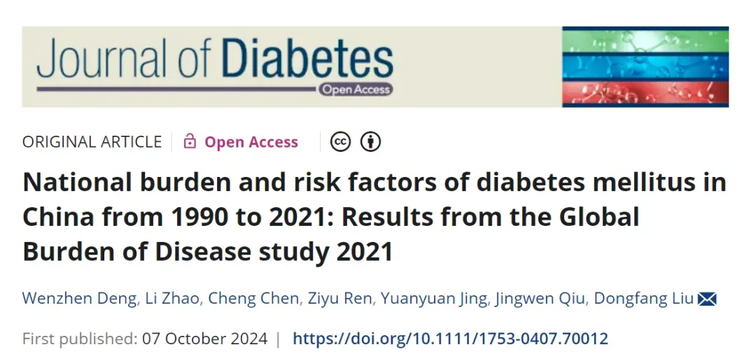 Deng, W., Zhao, L., Chen, C., Ren, Z., Jing, Y., Qiu, J., & Liu, D. (2024). National burden and risk factors of diabetes mellitus in China from 1990 to 2021: Results from the Global Burden of Disease study 2021. Journal of Diabetes, 16(10), e70012. https://doi.org/10.1111/1753-0407.70012温馨提示:本文仅作为科普文章,具体诊疗请在专业医生指导下进行