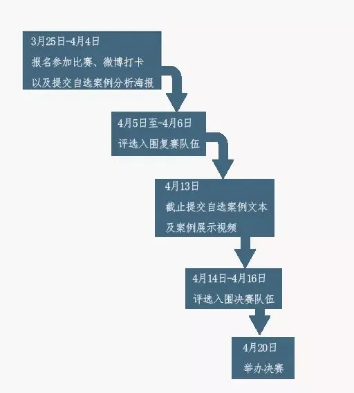 2019年3月25日起康腾实践中心微信公众号将录续发布微博打卡话题和自选案例文本,各参赛队伍按要求于2019年4月4日12:00前在微博平台打卡话题并提交自选案例分析海报至大赛指定邮箱: