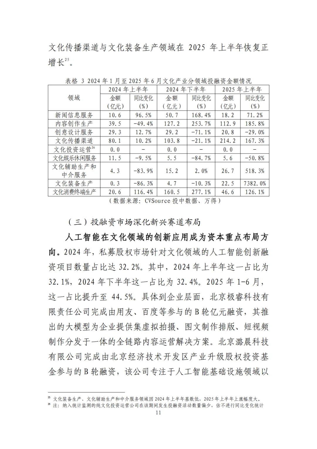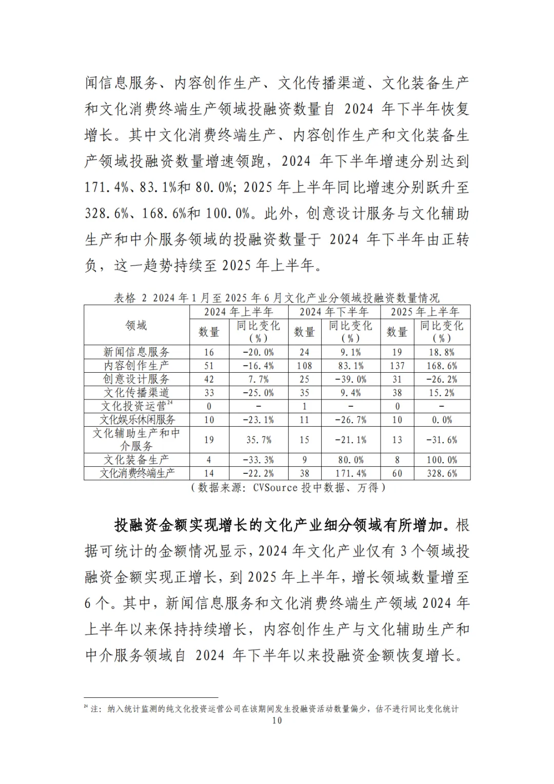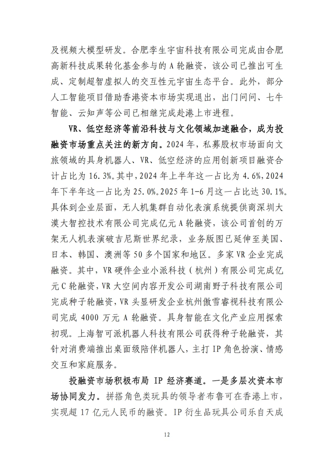 多领域投融资增长:文化消费终端、内容创作、文化装备等领域投融资增长显著,人工智能、VR/AR、低空经济等新兴赛道成为资本布局重点。
