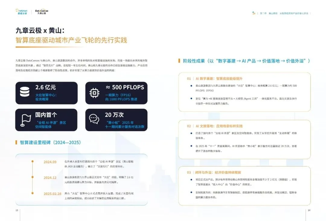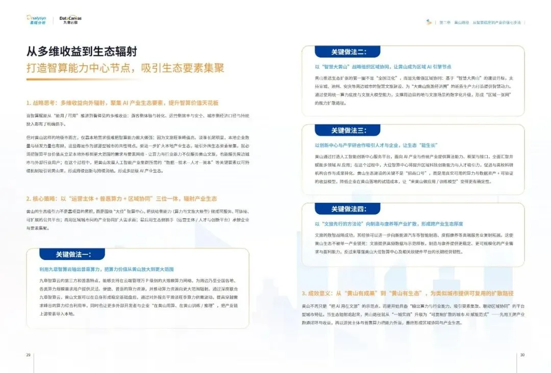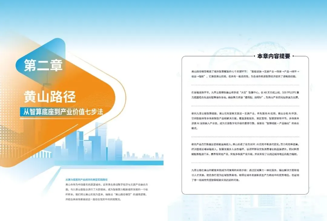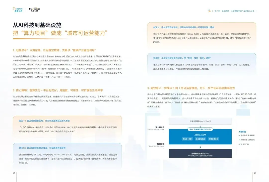 报告提炼出普适性的黄山路径七步法:即以可运营的智算云平台为底座,锚定本地王牌产业实现点火,聚焦高价值场景进行精准改造,将成功经验沉淀为标准化产品与能力包,通过数据回流与经营收益形成业务闭环,进而创造消费与产业侧的多维收益,最终打造区域智算能力中心,吸引生态要素集聚。这一路径揭示了#城市智算 发展的核心逻辑——必须以终为始,将算力建设深度融入地方主导产业的血脉,通过持续运营和价值闭环,方能将前沿技术真正转化为驱动城市高质量发展的内生动力。