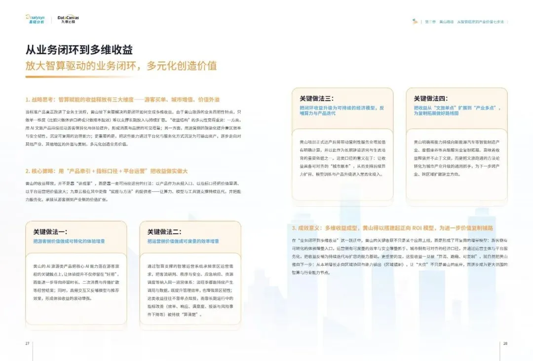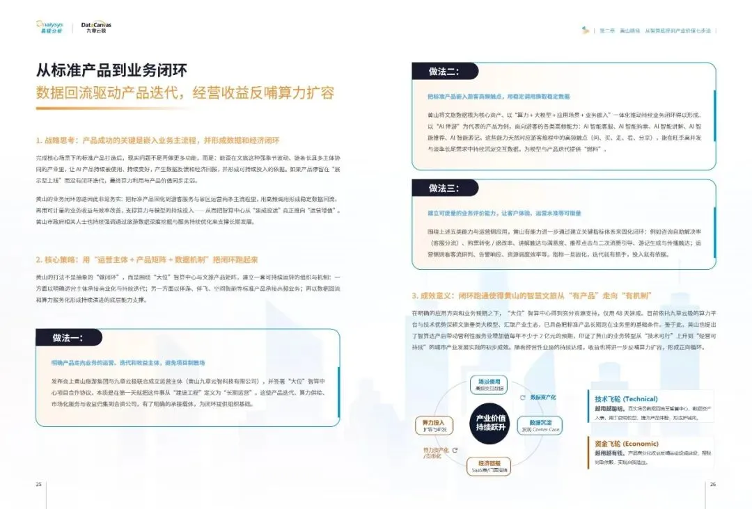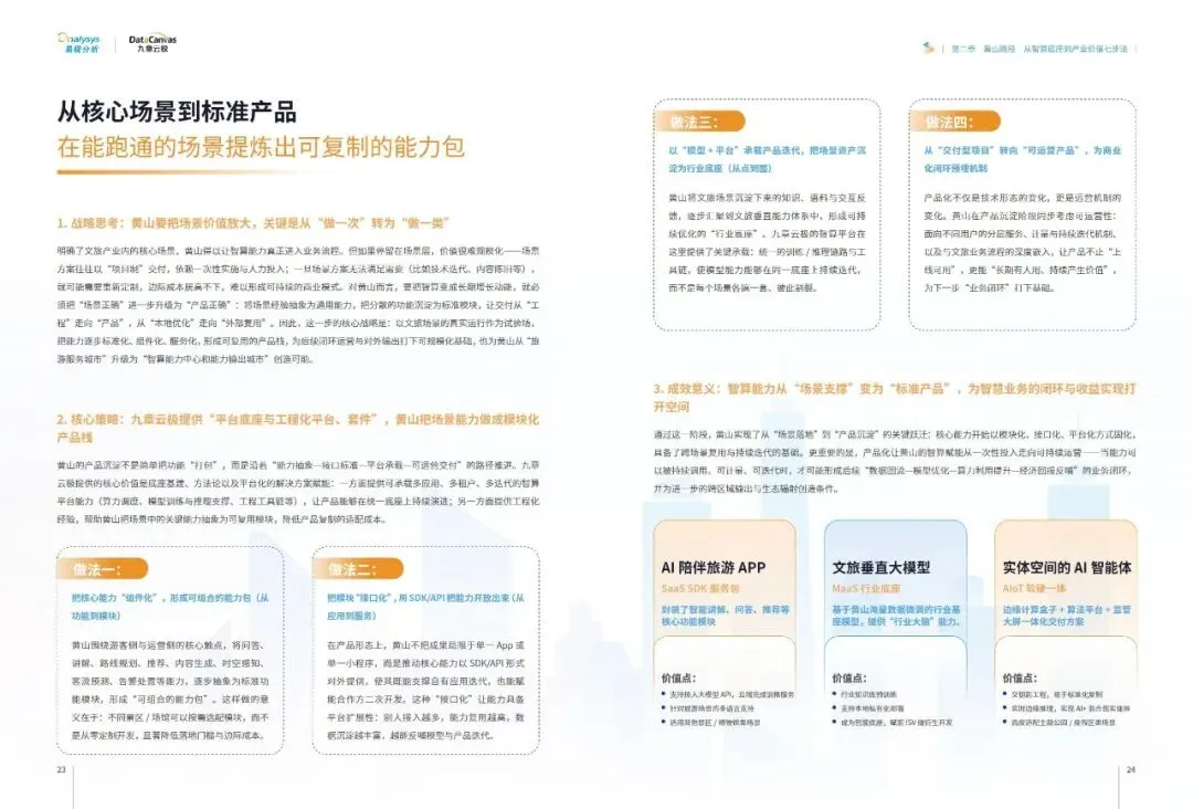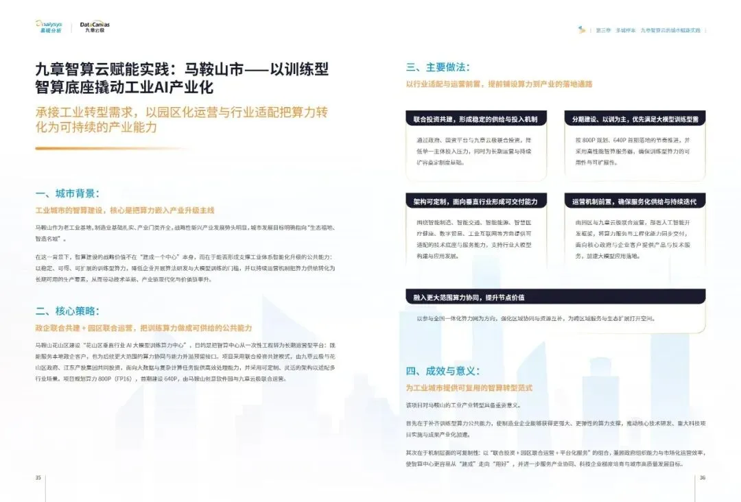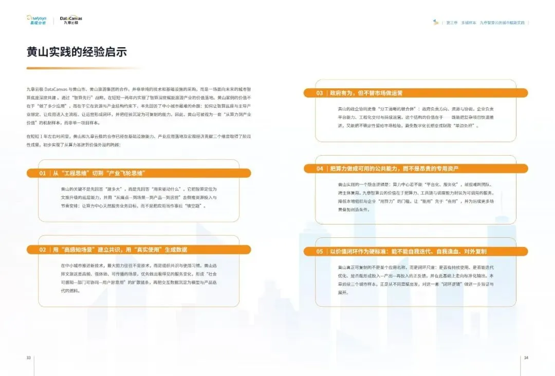 报告提炼出普适性的黄山路径七步法:即以可运营的智算云平台为底座,锚定本地王牌产业实现点火,聚焦高价值场景进行精准改造,将成功经验沉淀为标准化产品与能力包,通过数据回流与经营收益形成业务闭环,进而创造消费与产业侧的多维收益,最终打造区域智算能力中心,吸引生态要素集聚。这一路径揭示了#城市智算 发展的核心逻辑——必须以终为始,将算力建设深度融入地方主导产业的血脉,通过持续运营和价值闭环,方能将前沿技术真正转化为驱动城市高质量发展的内生动力。