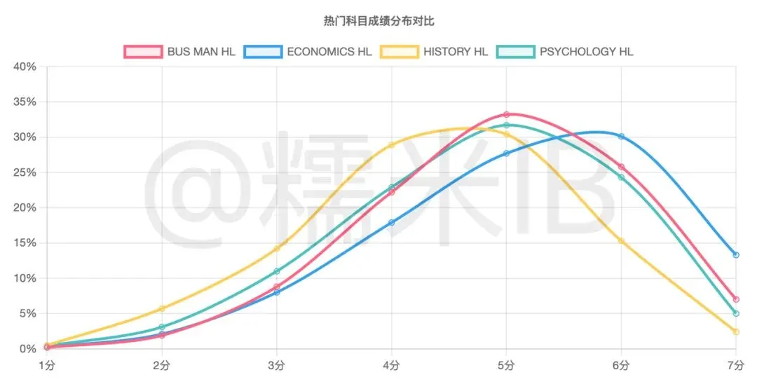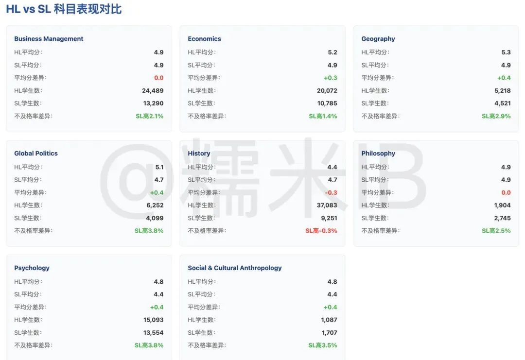 热门科目的 HL 难度和 SL 难度得分数据对比