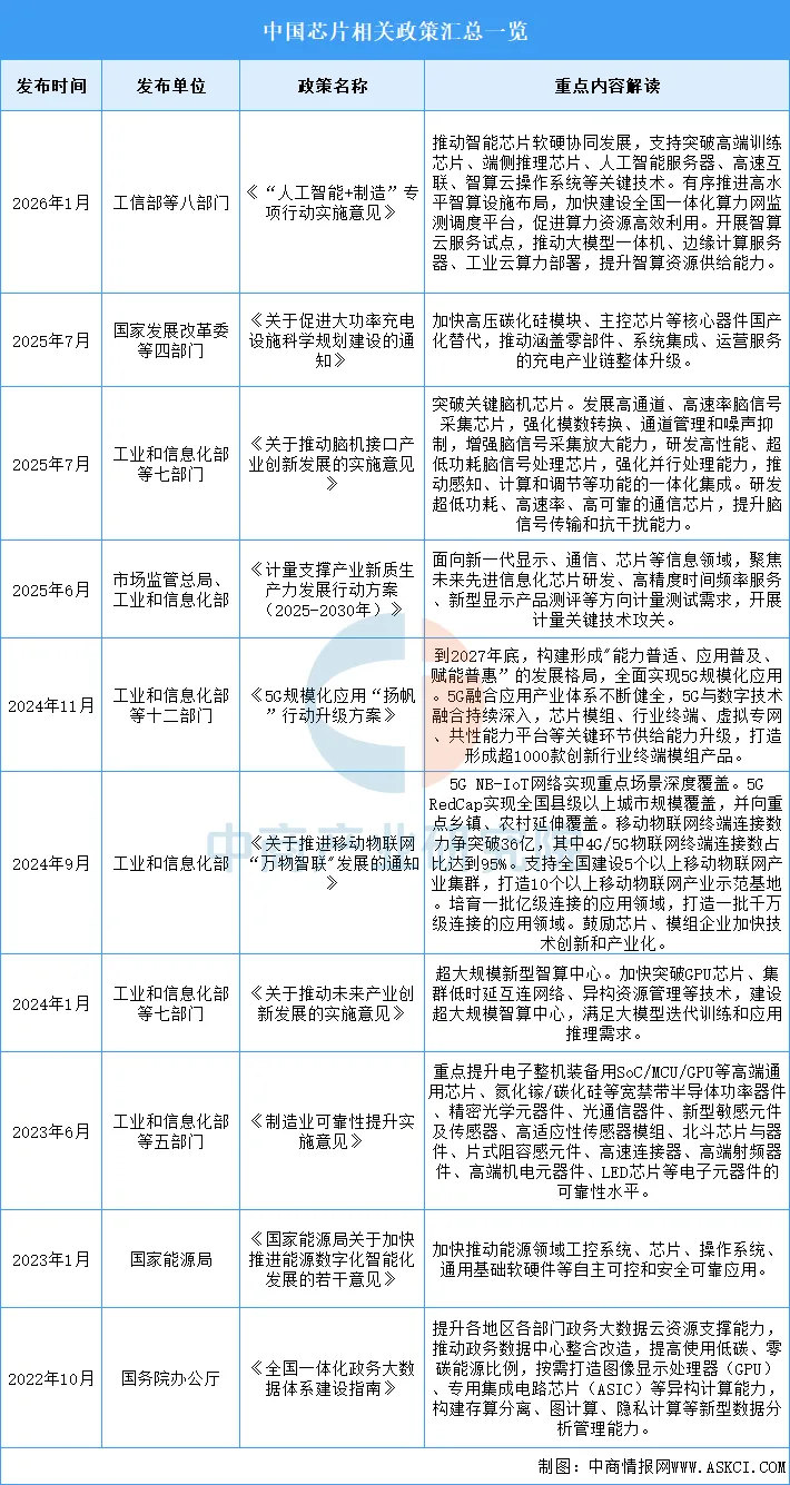 CPU作为芯片的一种,其发展深度受到国家芯片产业政策的影响。国家陆续出台了多项政策,鼓励芯片行业发展与创新,《“人工智能+制造”专项行动实施意见》《关于促进大功率充电设施科学规划建设的通知》《关于推动脑机接口产业创新发展的实施意见》等产业政策为芯片行业的发展提供了明确、广阔的市场前景,为企业提供了良好的生产经营环境。具体情况列示如下: