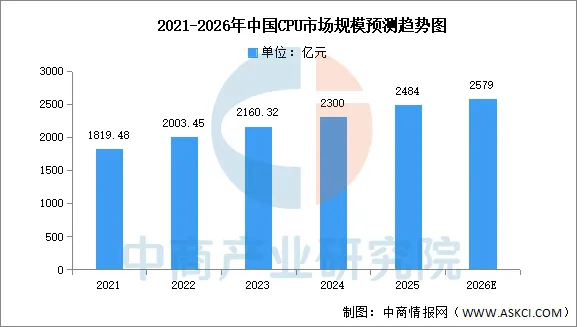 CPU的主要应用领域包括桌面和服务器,每台桌面通常只有一颗CPU,而每台服务器的CPU数量不定。中商产业研究院发布的《2025-2030年中国CPU市场前景预测深度研究报告》显示,2024年中国CPU行业市场规模约为2300亿元,2025年将达2484亿元。中商产业研究院分析师预测,2026年市场规模有望接近2600亿元。