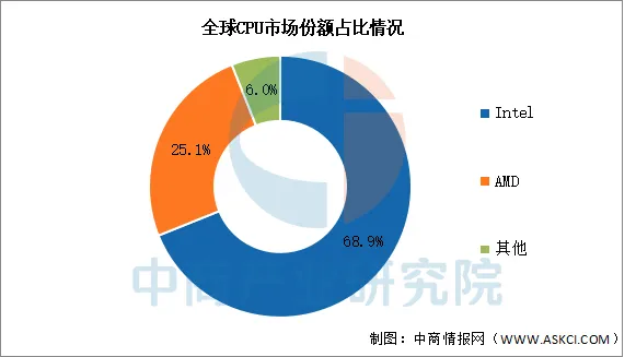 目前,全球CPU市场由Intel主导,市场份超过整体的一半,达到68.9%。AMD占据25.1%的市场,排名第二。