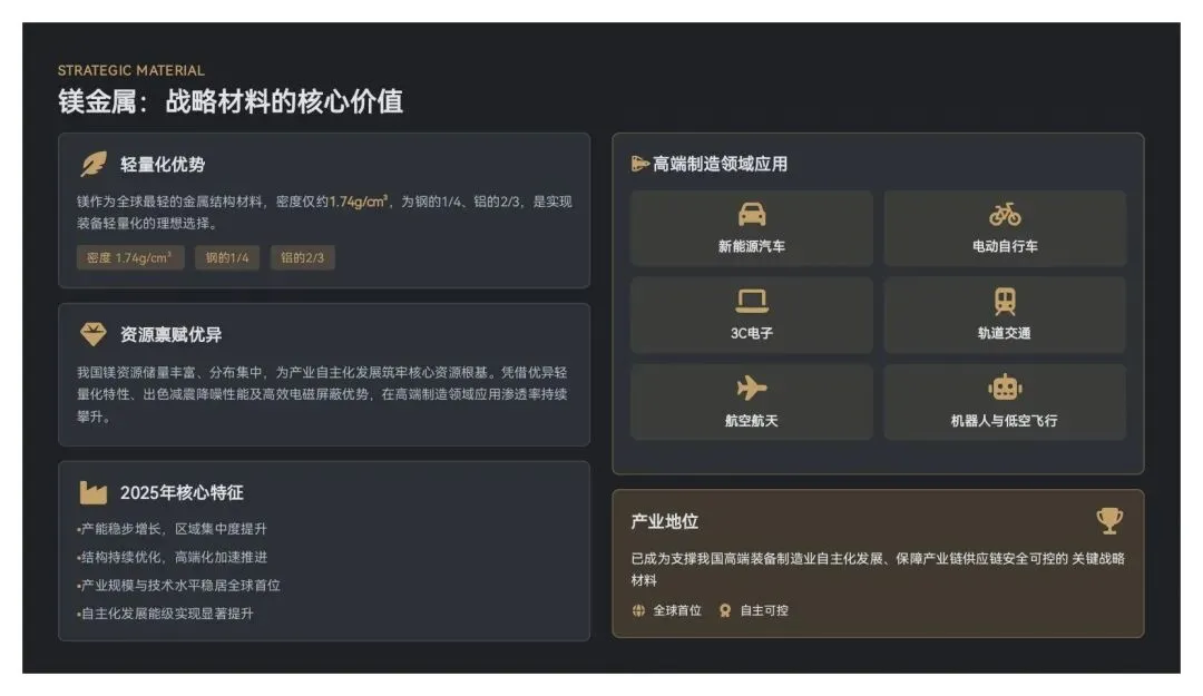 镁作为十大常用金属之一,密度仅约1.74g/cm³,为钢的1/4、铝的2/3,是全球最轻的金属结构材料。我国镁资源禀赋优异,储量丰富、分布集中,为产业自主化发展筑牢核心资源根基;其凭借优异轻量化特性、出色减震降噪性能及高效电磁屏蔽优势,在新能源汽车、电动自行车、3C电子、轨道交通、航空航天、机器人与低空飞行等高端制造领域应用渗透率持续攀升,已成为支撑我国高端装备制造业自主化发展、保障产业链供应链安全可控的关键战略材料。