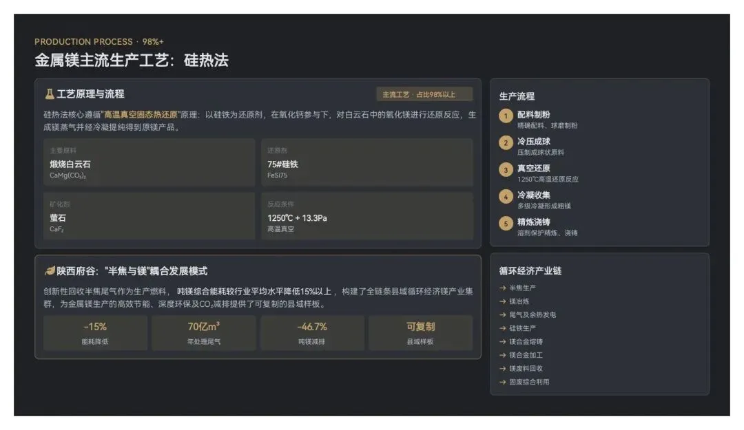 陕西府谷依托“半焦与镁冶炼”耦合发展模式,创新性回收半焦尾气作为生产燃料,吨镁综合能耗较行业平均水平降低15%以上,构建了涵盖“半焦→镁冶炼→尾气及余热发电→硅铁→镁合金熔铸→镁合金加工→镁废料回收→固废综合利用”的全链条县域循环经济镁产业集群,为金属镁生产的高效节能、深度环保及CO₂减排提供了可复制的县域样板。