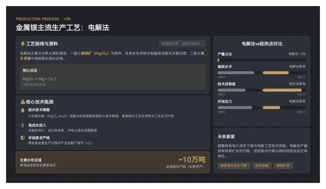 电解法镁冶炼主要分为两大原料路线:一是以菱镁矿(MgCO₃)为原料,经多步化学转化制备高纯度无水氯化镁(MgCl₂);二是从海水资源中提取氯化镁水合物,其核心技术瓶颈在于六水氯化镁(MgCl₂·6H₂O)结晶水的深度脱除,直接制约工艺经济性与工业化可行性。该工艺还存在设备投资大、运行耗电高、环保要求严等问题,尤其需妥善处置生产过程中产生的副产氯气。目前我国电解法商品原镁产量占比不足2%,主要集中在青海盐湖等资源富集地区。随着绿色电力成本下降与电解工艺技术突破,电解法产量或有局部扩张的可能,但短期内仍难以撼动硅热法的主导地位。