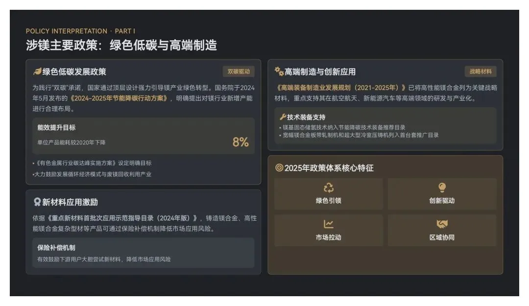 1. 绿色低碳发展政策:为践行“双碳”承诺,国家通过顶层设计强力引导镁产业绿色转型。国务院于2024年5月发布的《2024-2025年节能降碳行动方案》,明确提出对镁行业新增产能进行合理布局。根据《有色金属行业碳达峰实施方案》等政策文件要求,我国设定了明确的能效提升与碳减排目标:镁行业单位产品能耗需较2020年下降8%左右,并显著提升碳减排成效。旨在推动行业绿色低碳转型,提升可持续发展水平。还大力鼓励发展循环经济模式与废镁回收利用产业,推动全生命周期绿色发展。