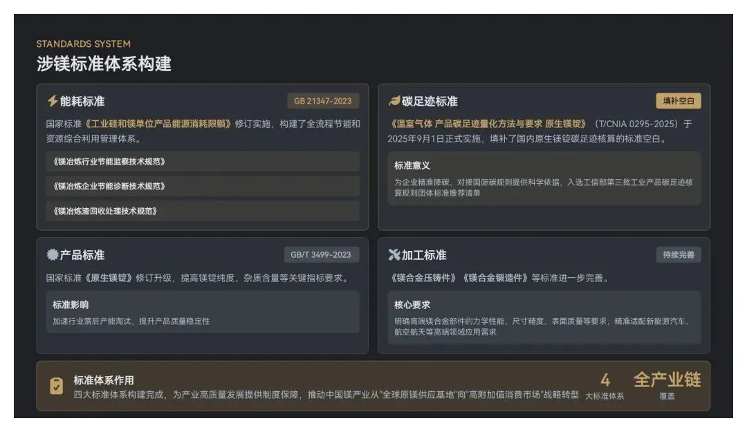 碳足迹标准:《温室气体产品碳足迹量化方法与要求原生镁锭》(T/CNIA 0295-2025)于2025年9月1日正式实施,并入选工信部第三批工业产品碳足迹核算规则团体标准推荐清单,填补了国内原生镁锭碳足迹核算的标准空白,为企业精准降碳、对接国际碳规则提供科学依据 。