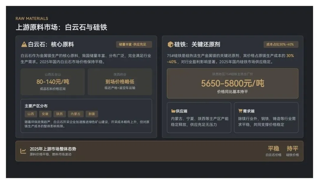 金属镁产业上游主要包括白云石、硅铁等原料,以及发生炉煤气、天然气、半焦尾气等燃料,其价格波动与供应稳定性直接影响原镁生产成本与行业盈利能力。2025年,上游市场整体呈现“原料价格平稳、燃料市场波动”的态势。