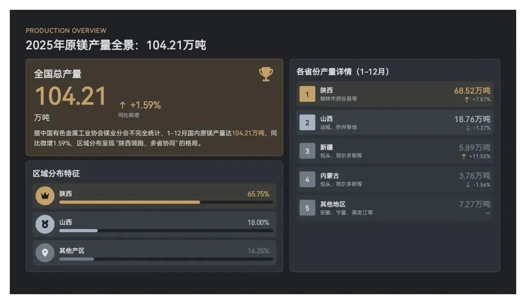 2025年,我国原镁产量持续增长,据中国有色金属工业协会镁业分会不完全统计,1-12月国内原镁产量达104.21万吨,同比微增1.59%,区域分布呈现“陕西领跑、多省协同”的格局,产能加速向资源禀赋好、循环经济成熟的地区集中。